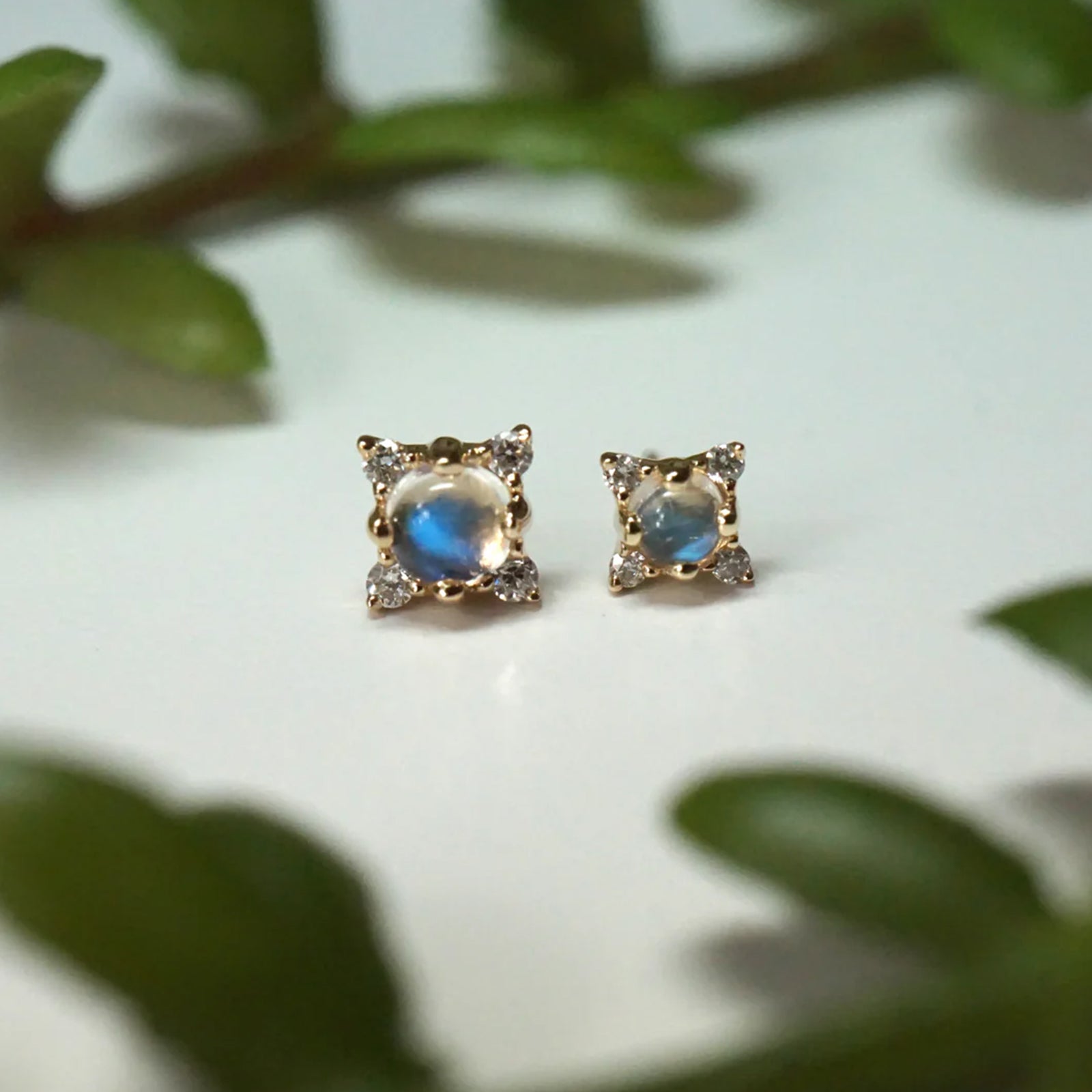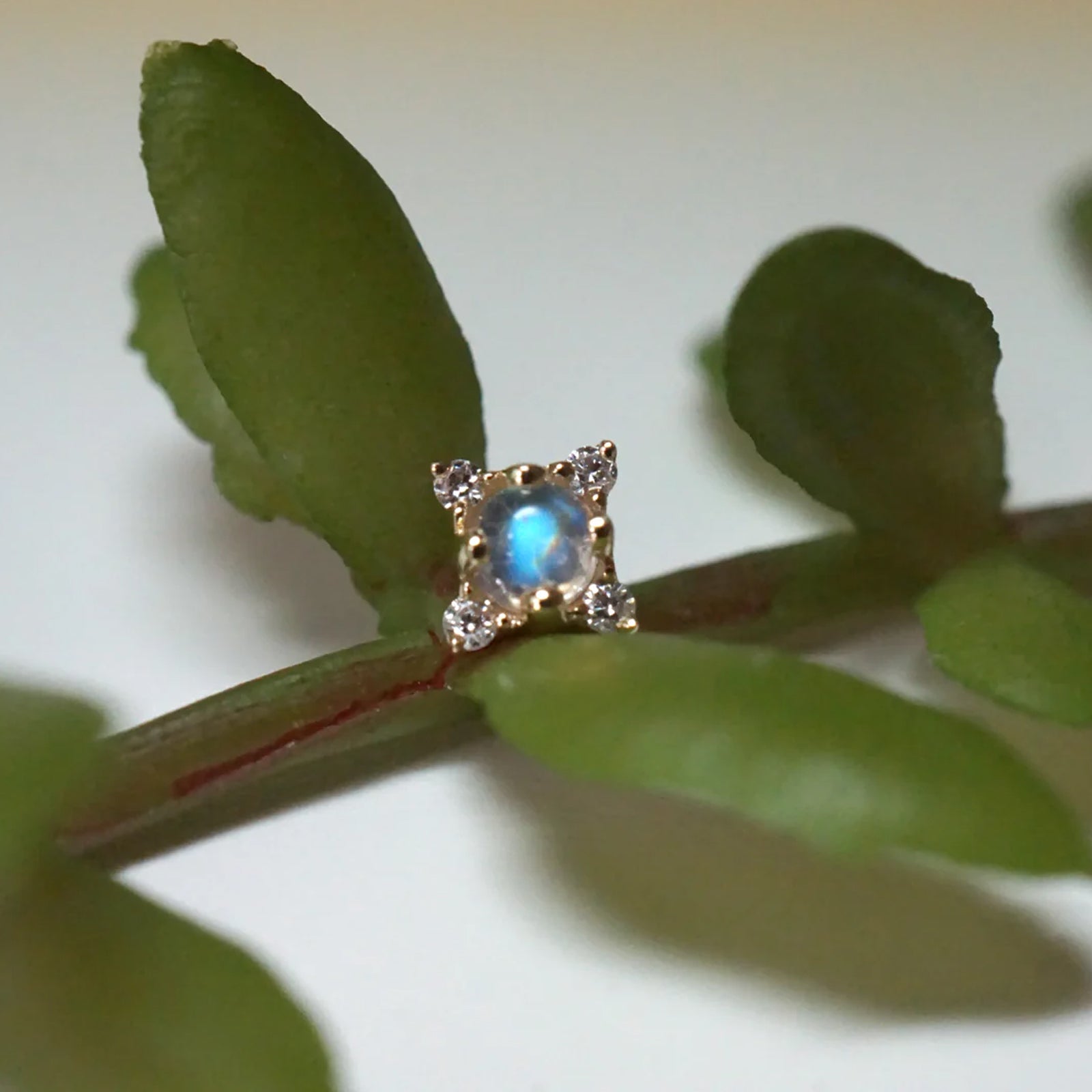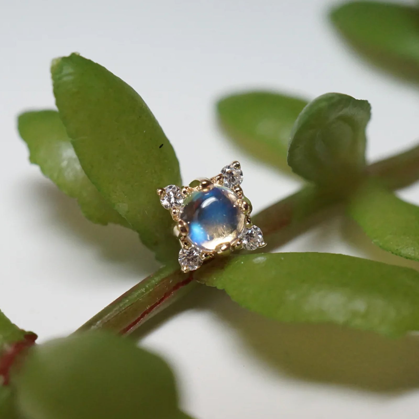 One round cabochon gemstone center and 1 diamond at each 4 points