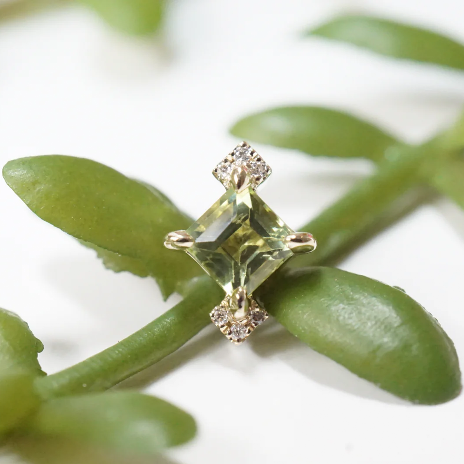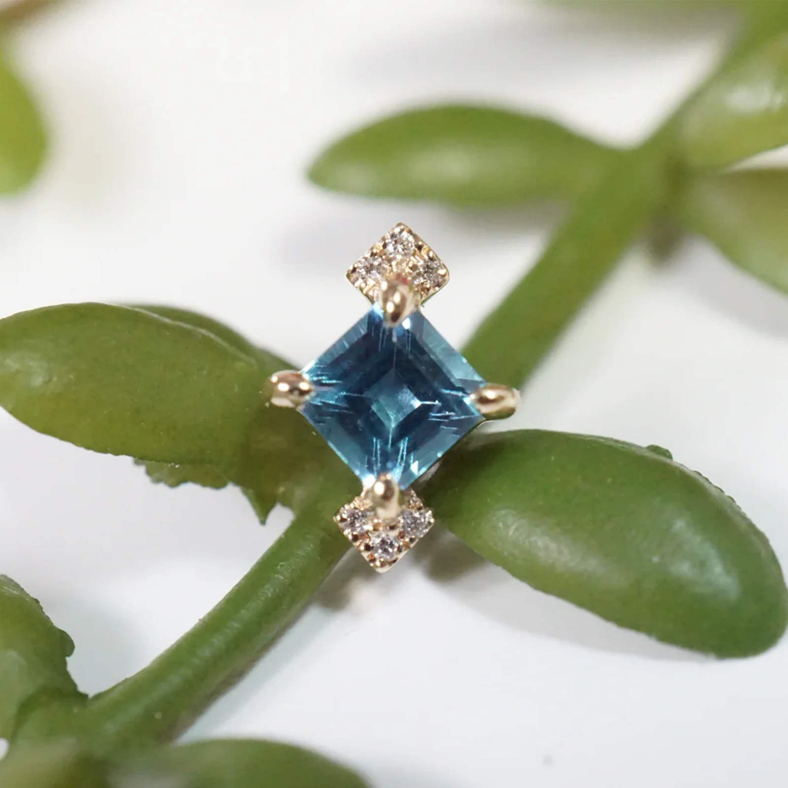 Princess cut gemstone with 3 diamond accents in 2 corners
