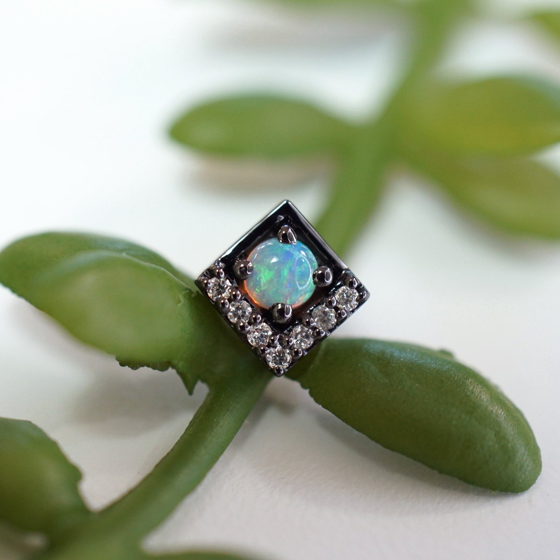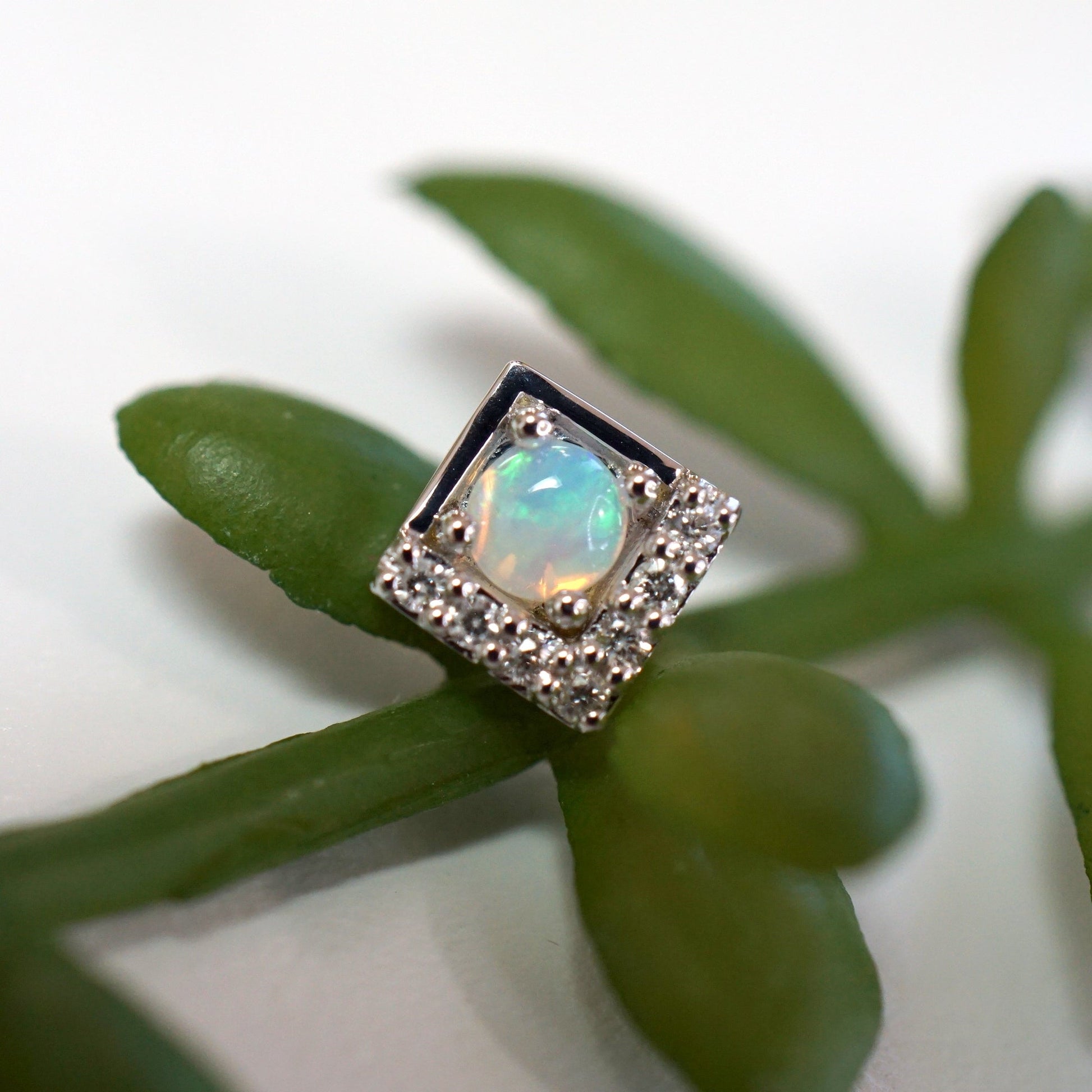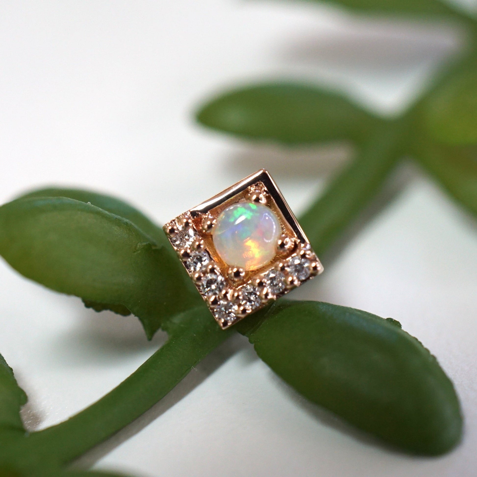 Cabochon moonstone set in square platform with paved diamonds along two of the sides.