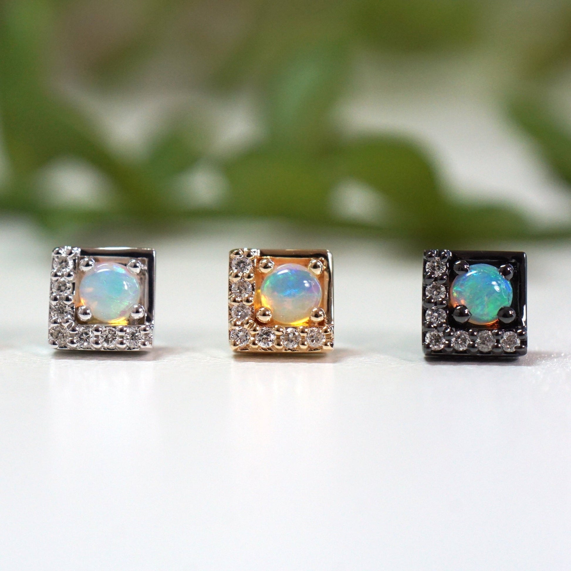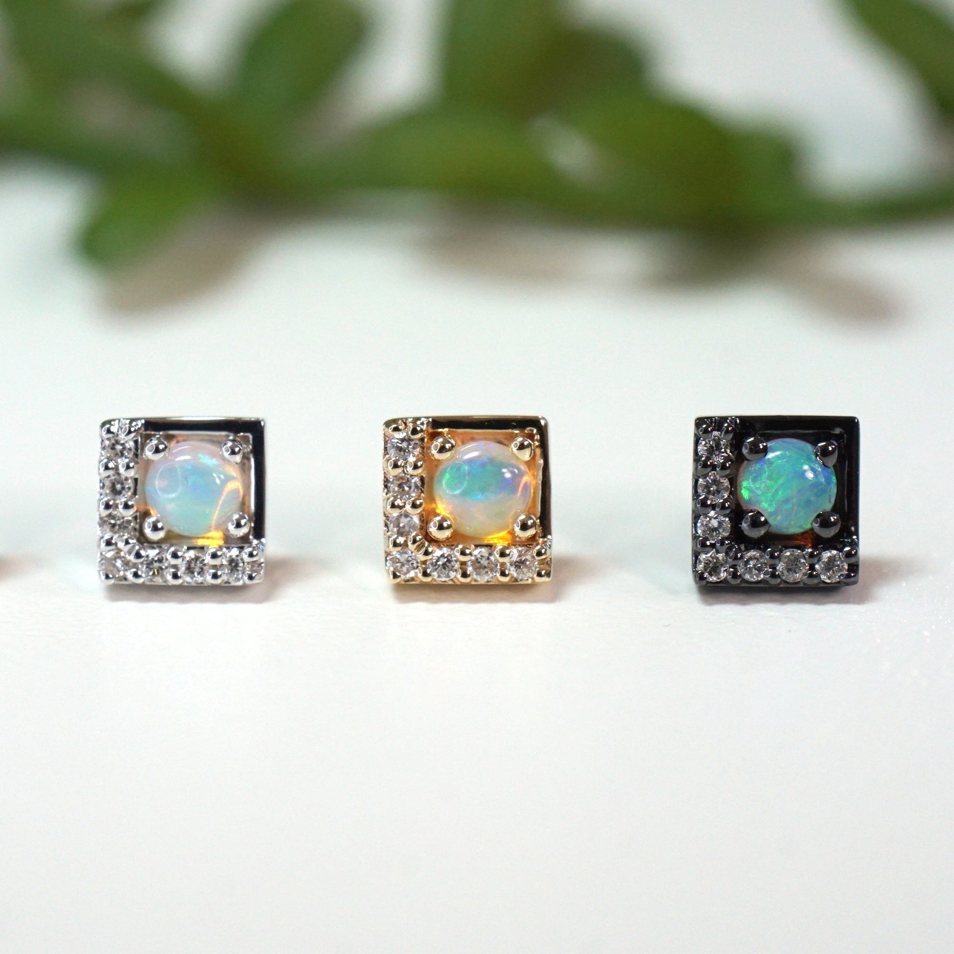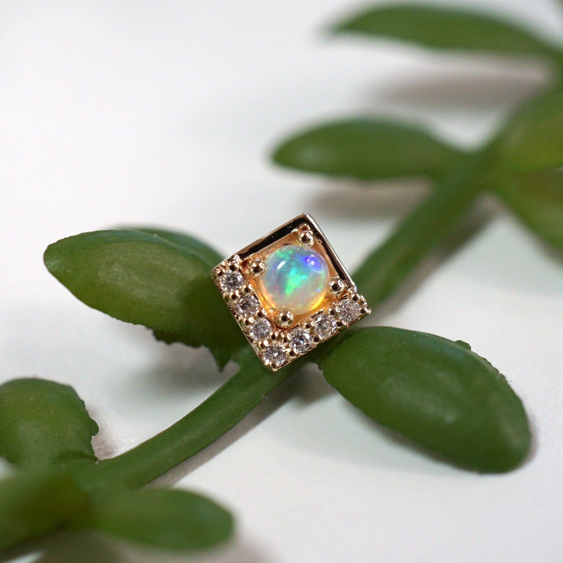 Cabochon moonstone set in square platform with paved diamonds along two of the sides.