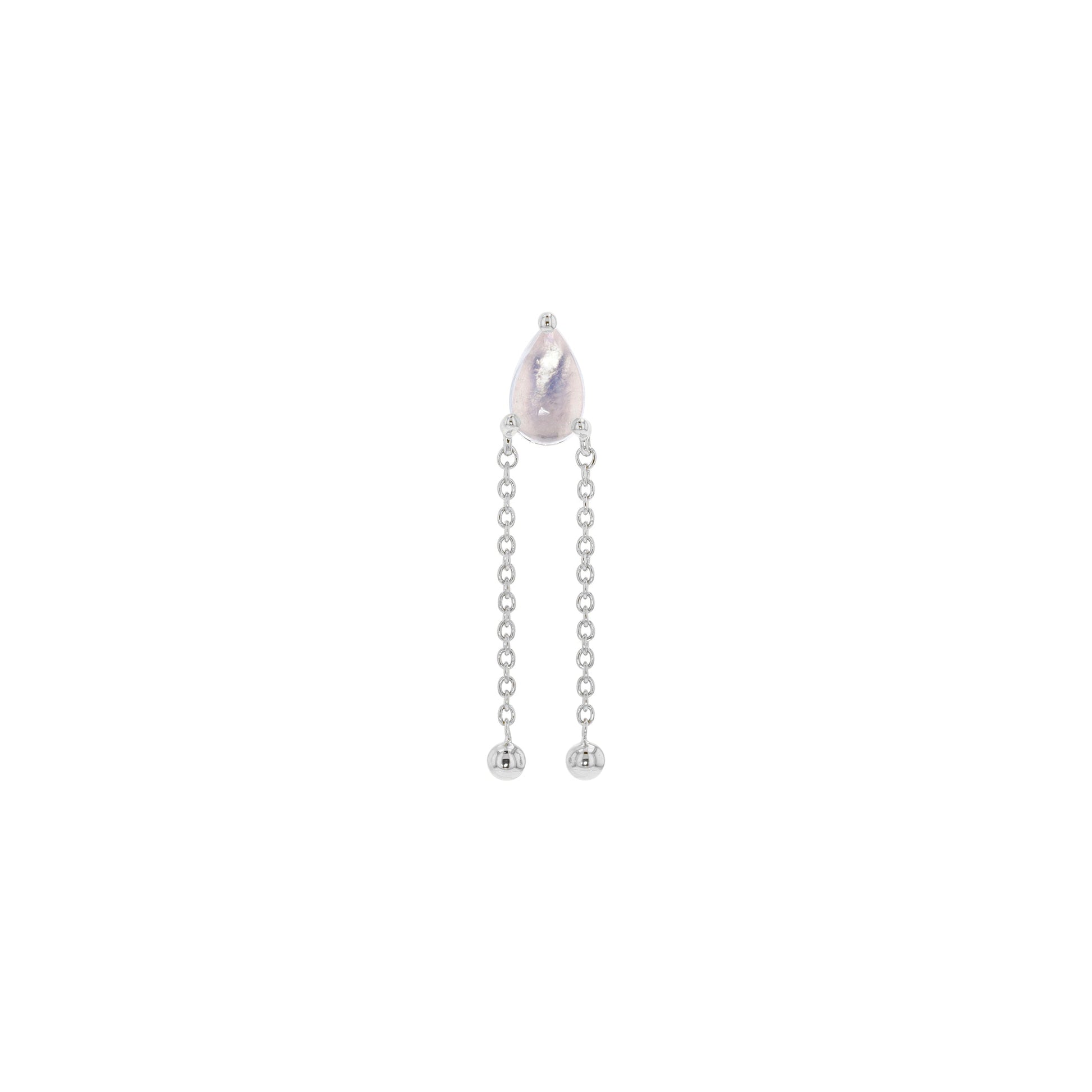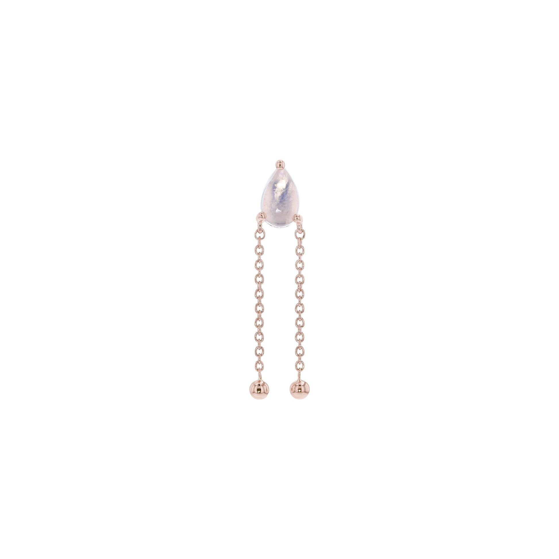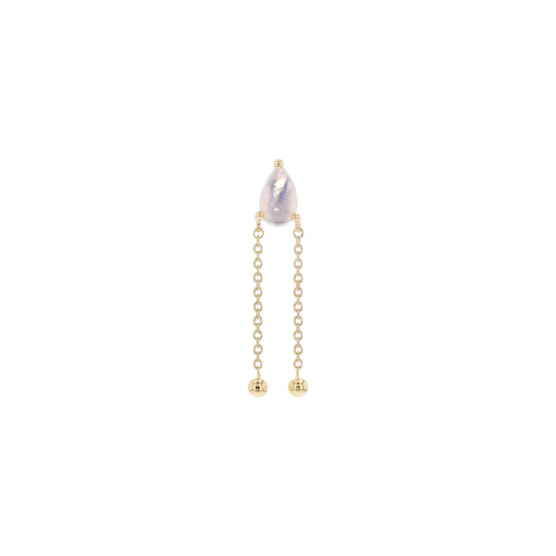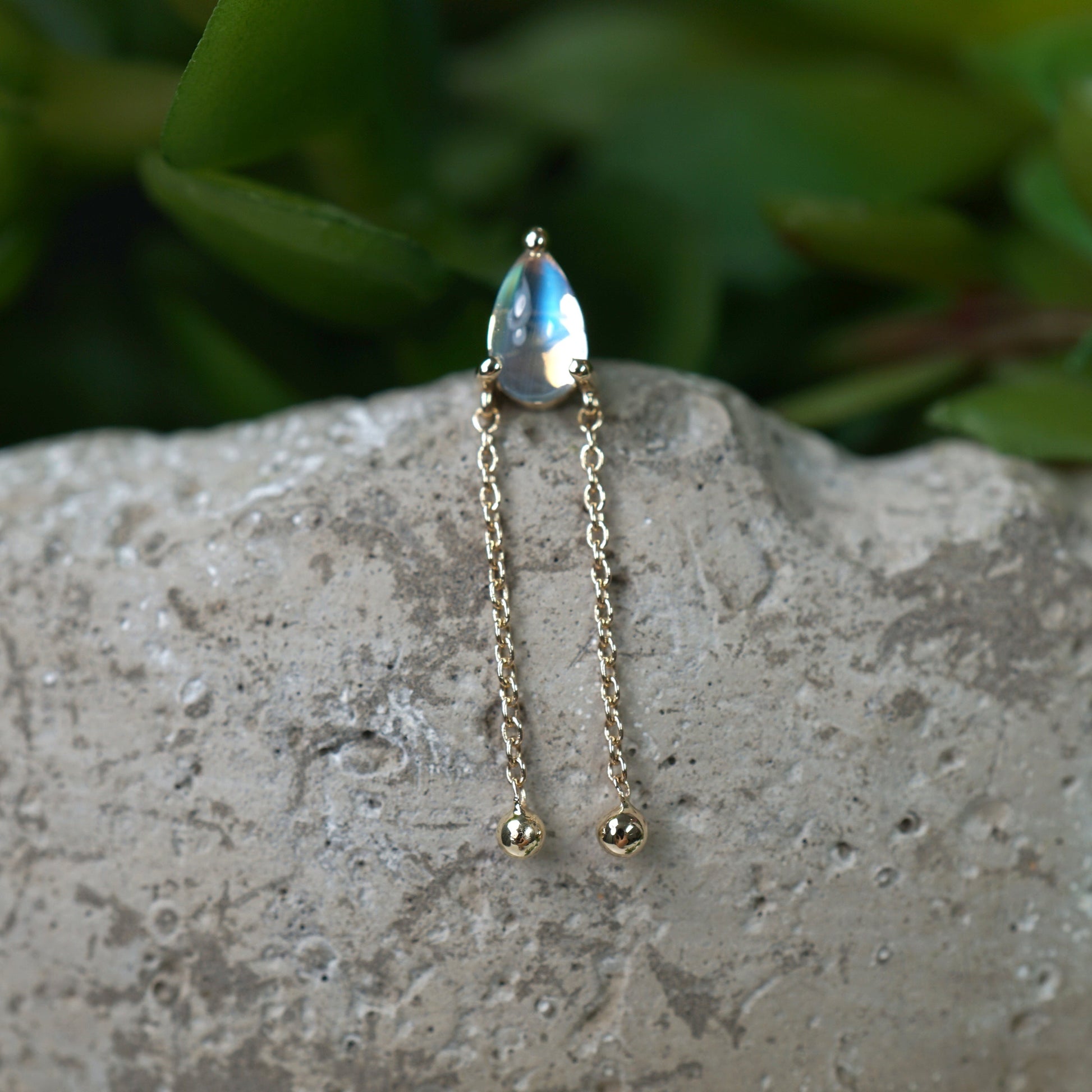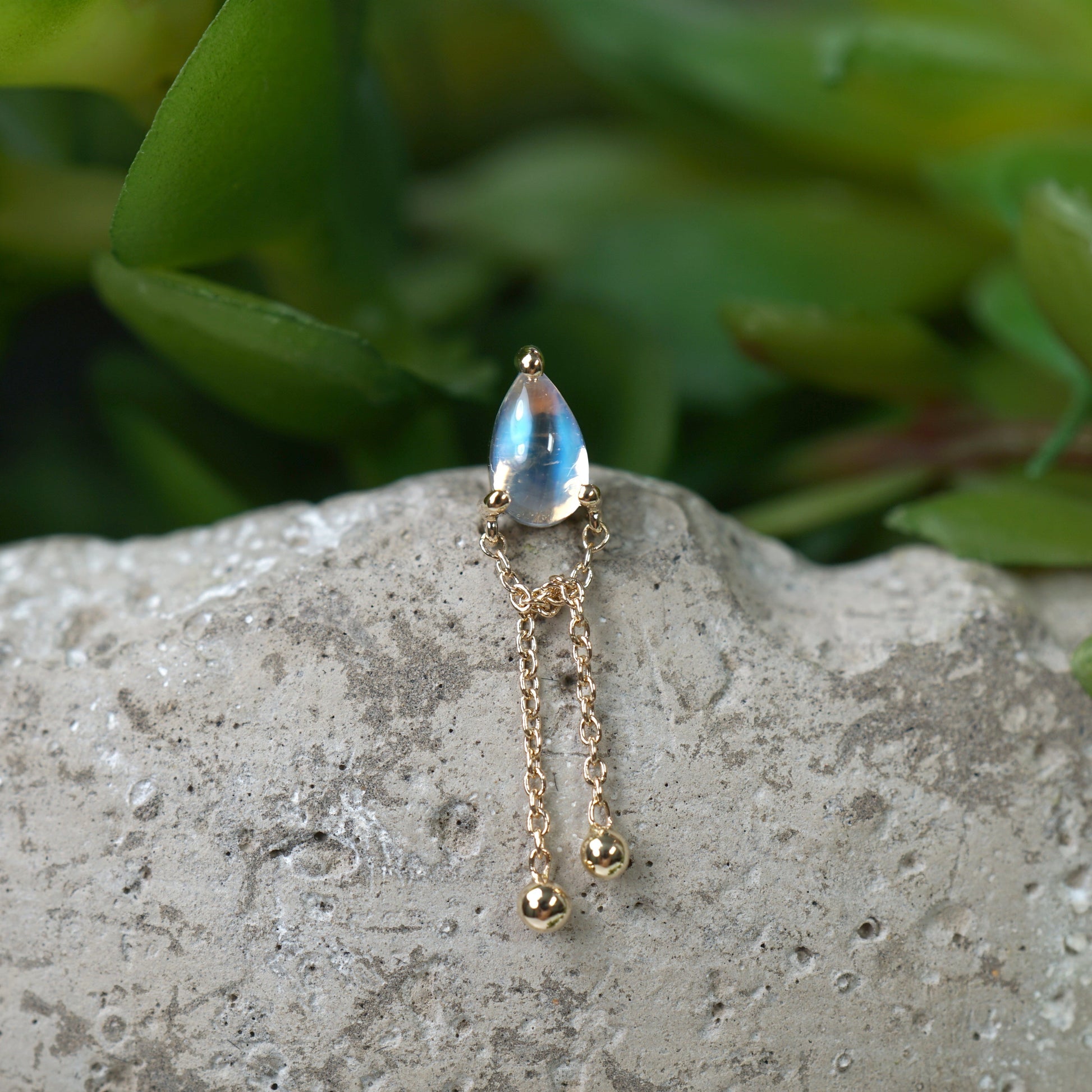 Prong set pear cut moonstone threadless end with dual chains and gold beads. Chain is meant to be knotted in a creative fashion