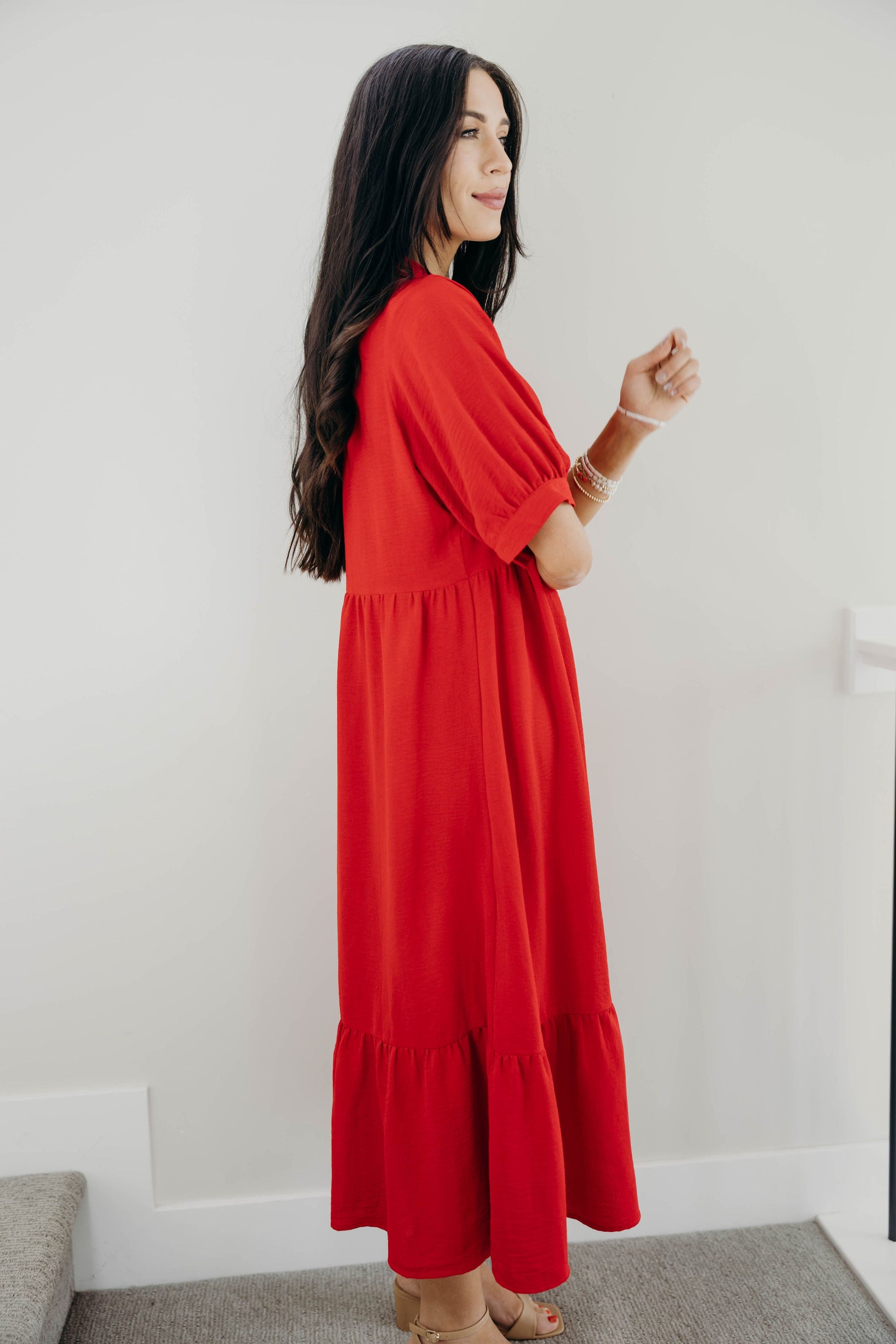 Maxi length dress with ruffle hem, functioning buttons, collar, and short puff sleeves.
