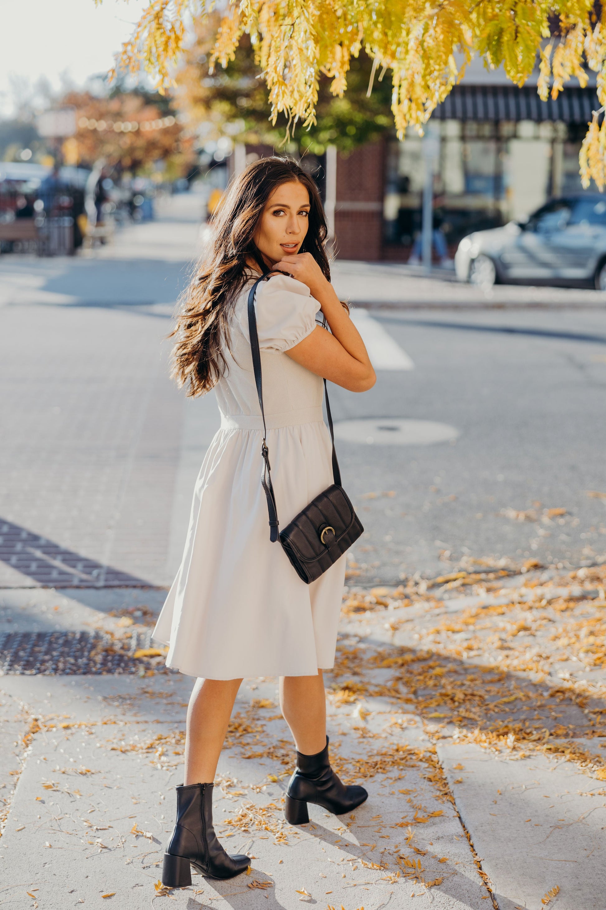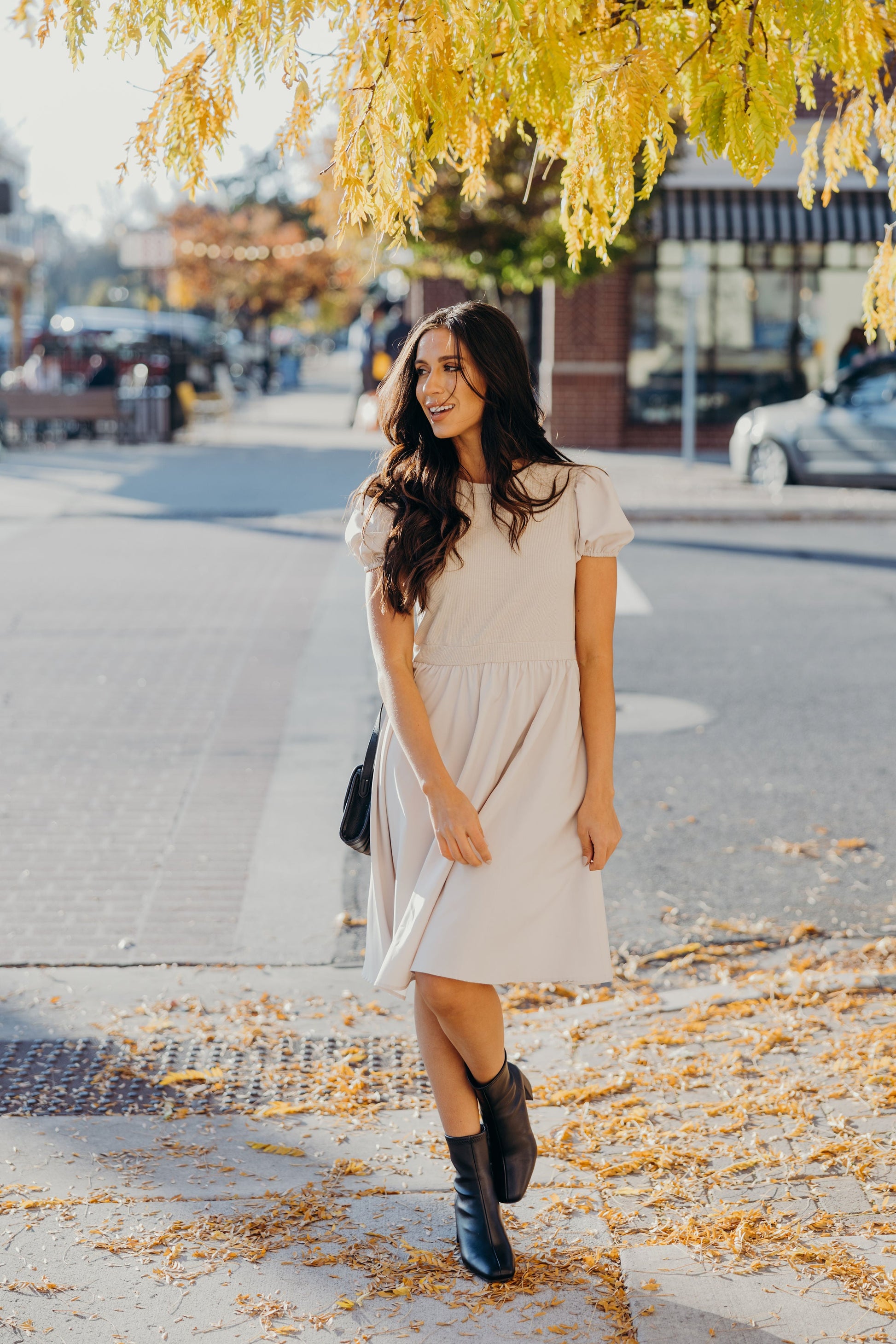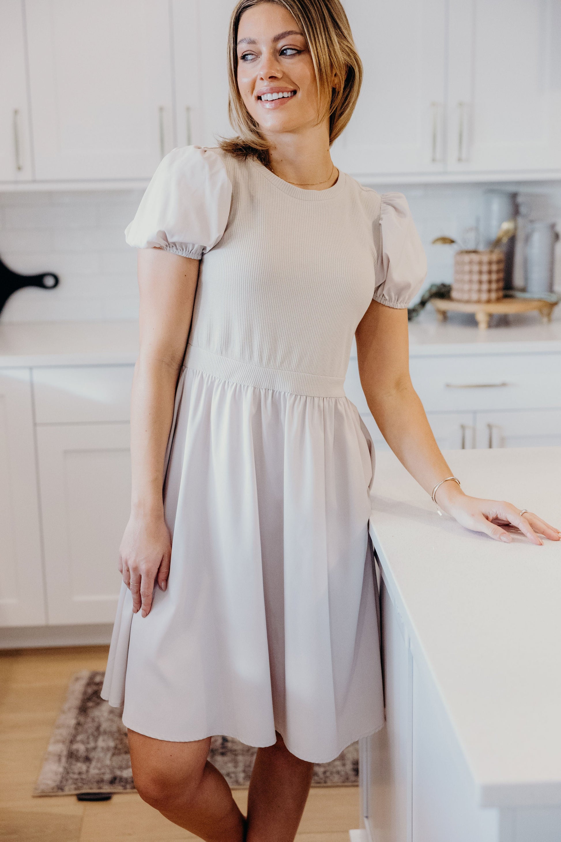 Knee length dress with crew neckline, short puff sleeves, contrast detail on bodice and natural waistline.