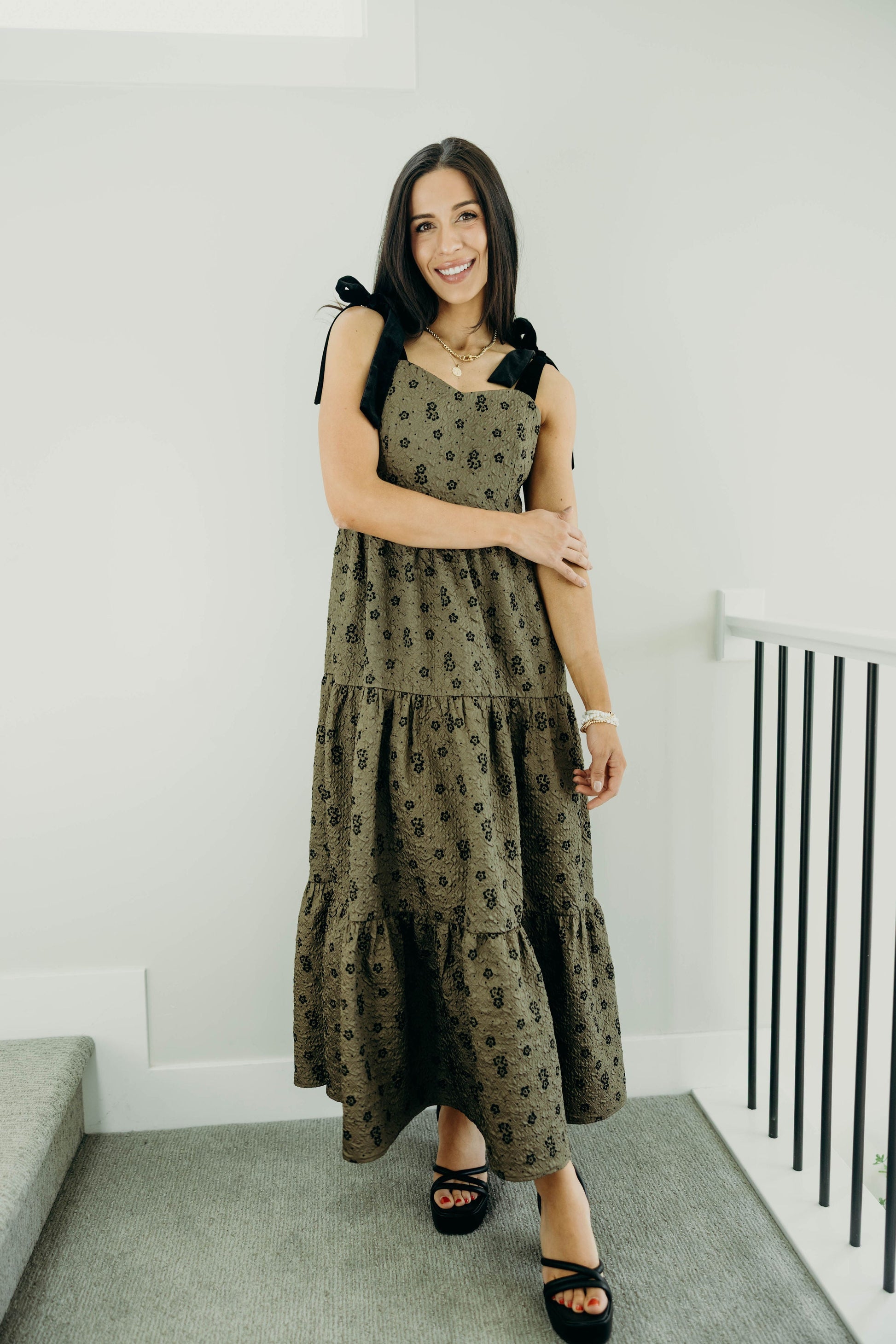 Midi length overall dress with tiered skirt, sweetheart neckline, velvet shoulder ties, and zipper closure.