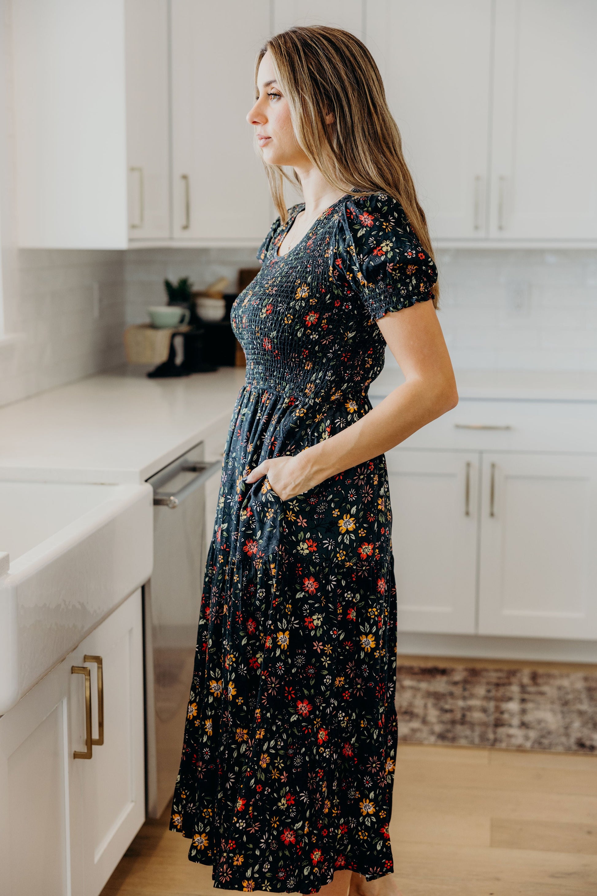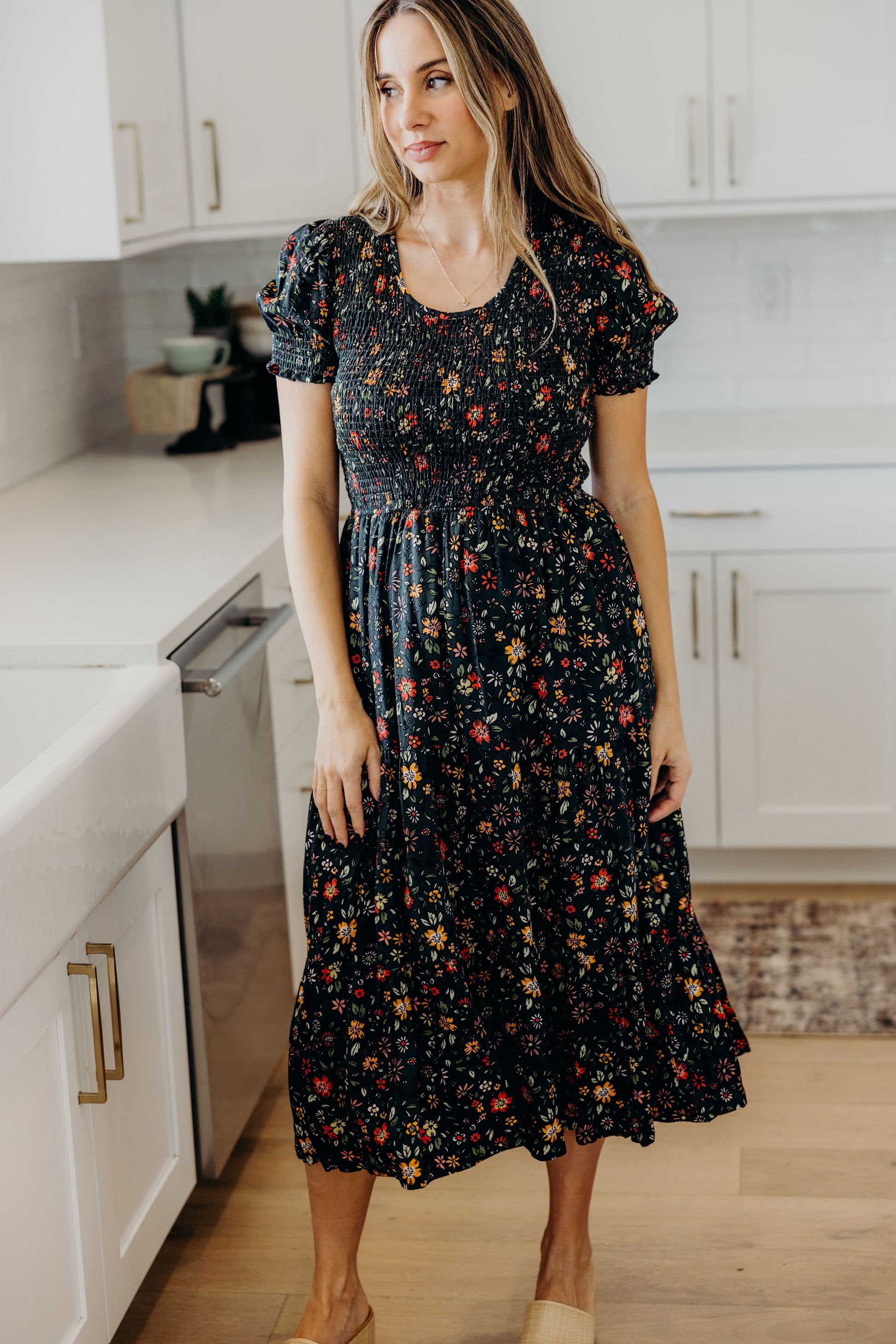 Midi length dress with tiered skirt, smocked bodice, and puff sleeves with ruffle cuffs.