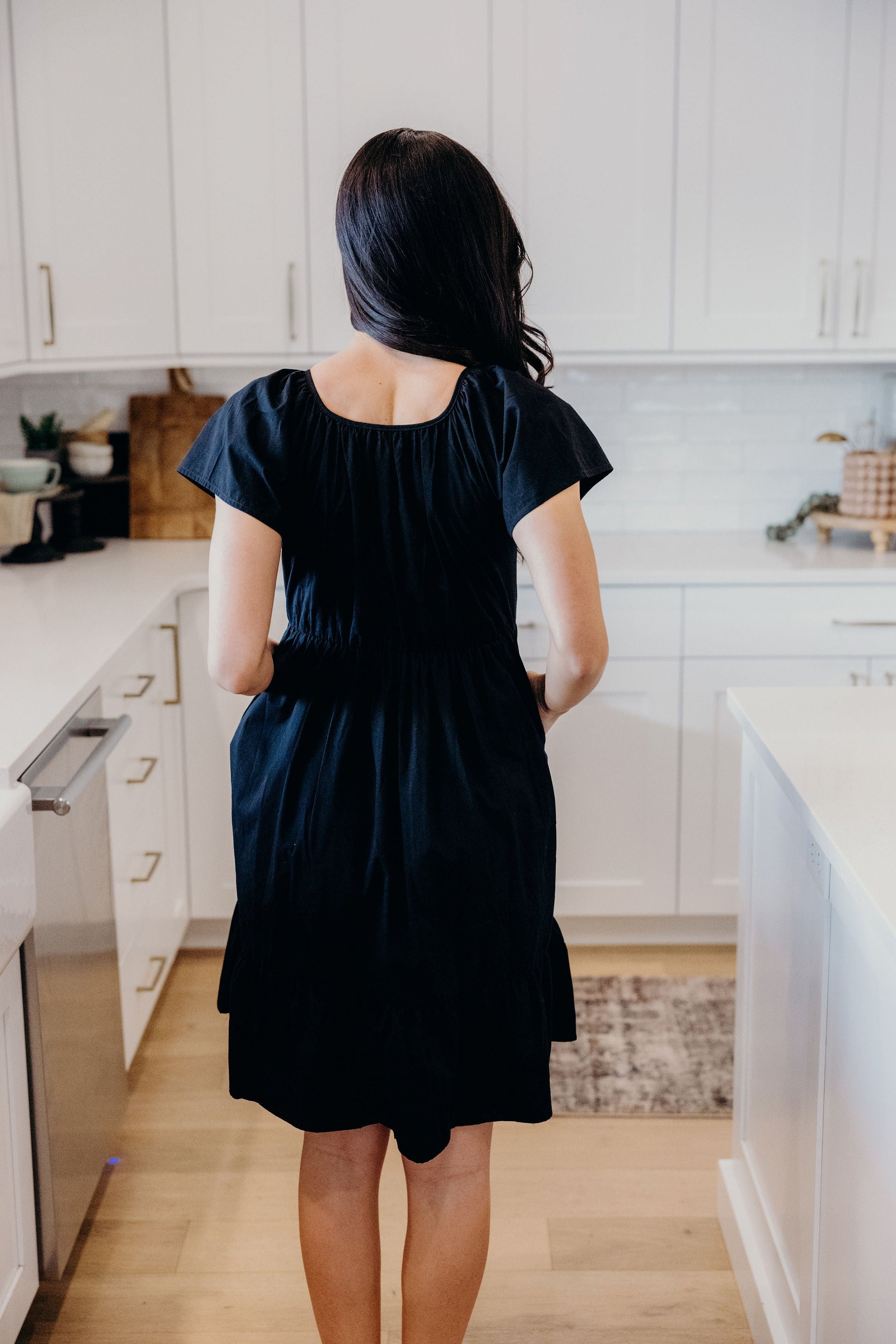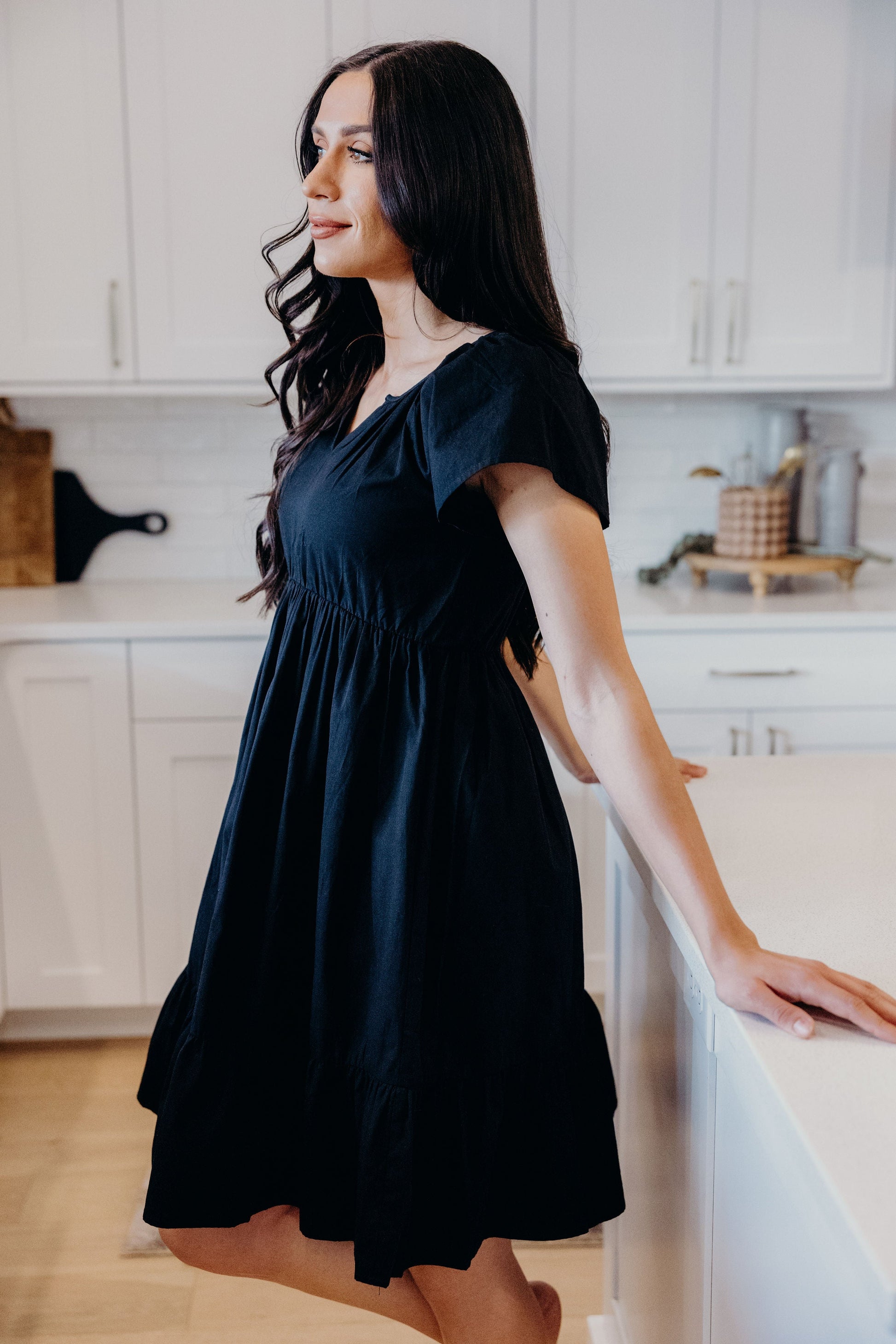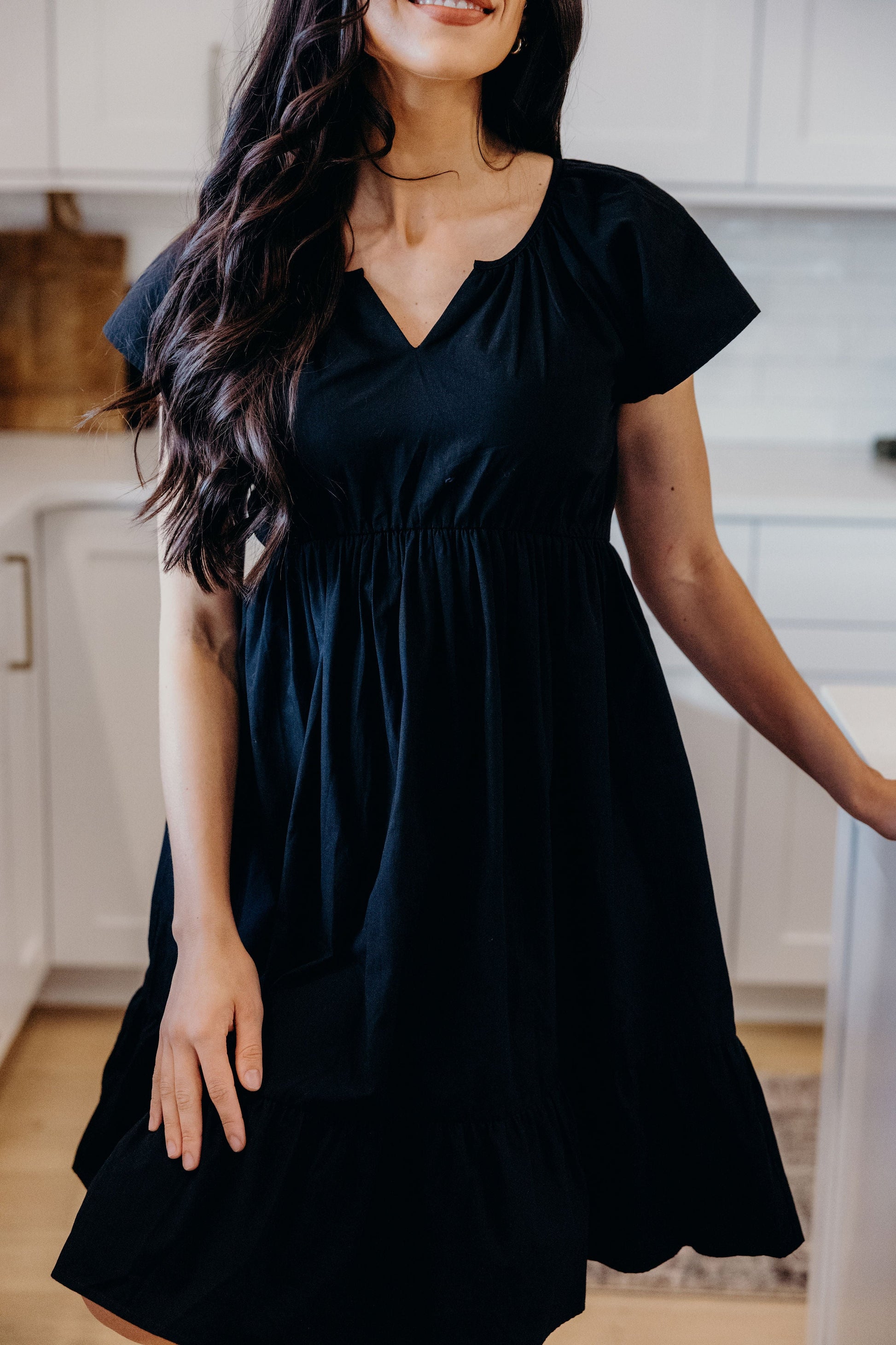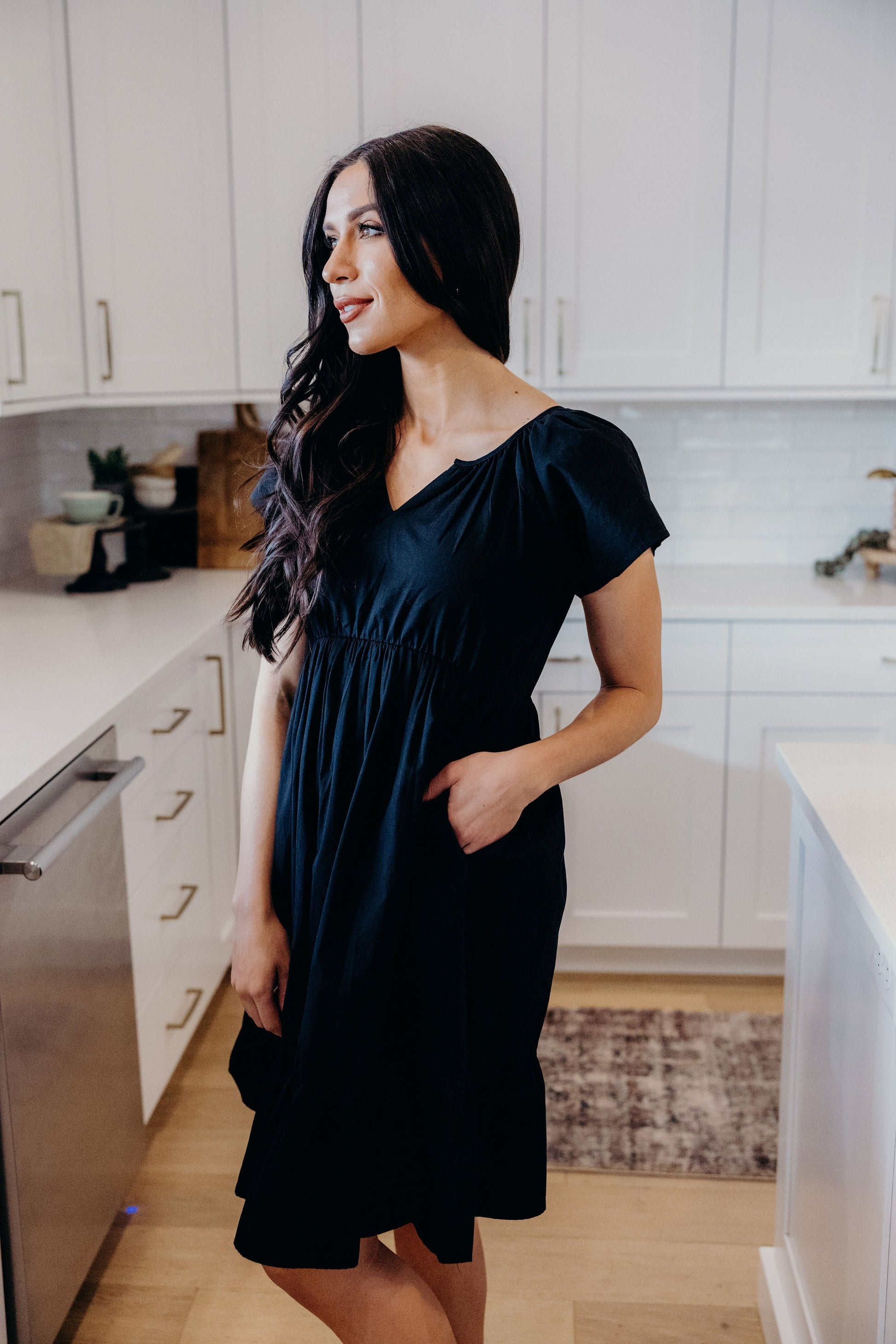 Knee length dress with elastic waist, tiered skirt, short sleeves, v neckline, and pockets.