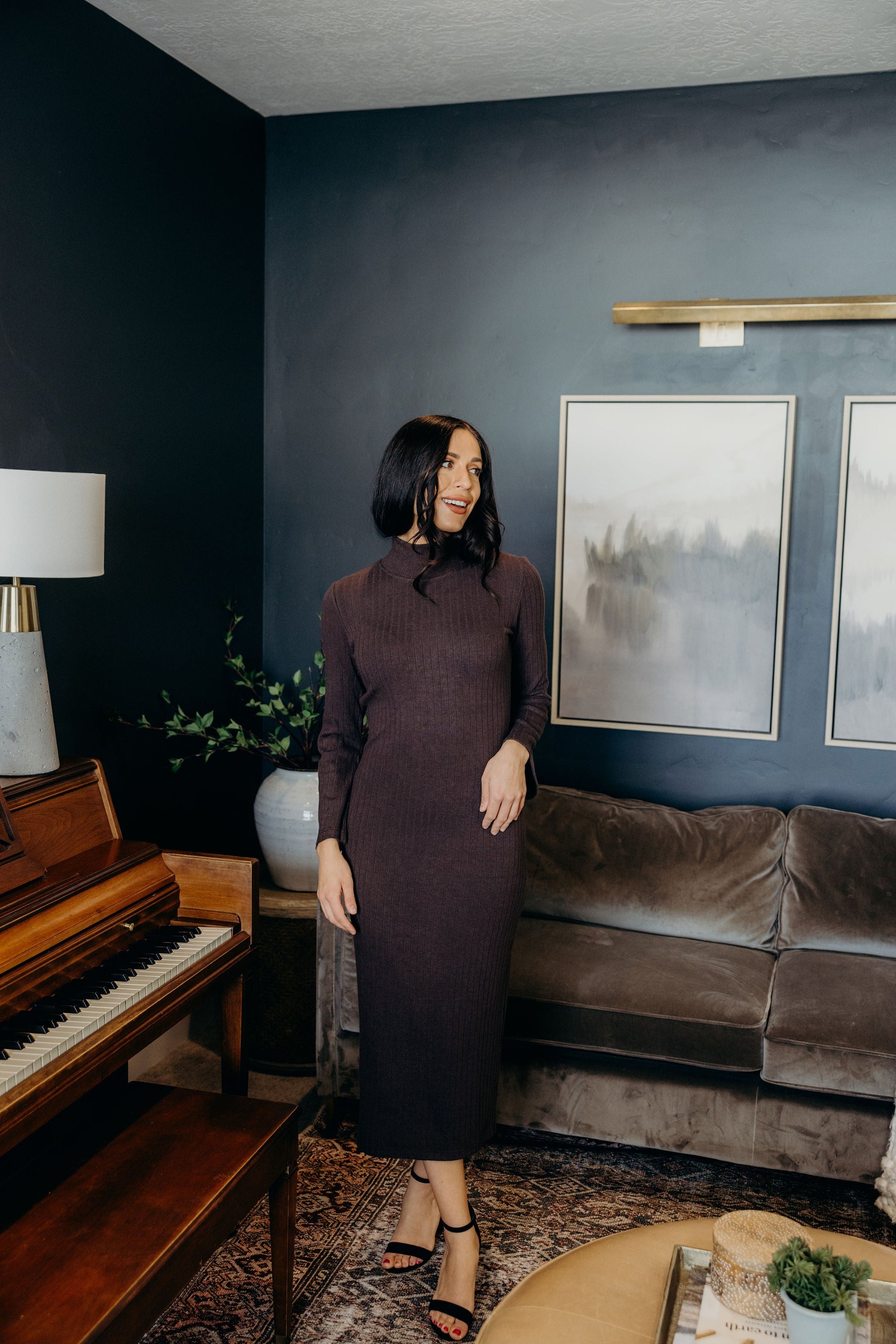 Long sleeve midi length sweater dress with turtleneck and ribbed texture.