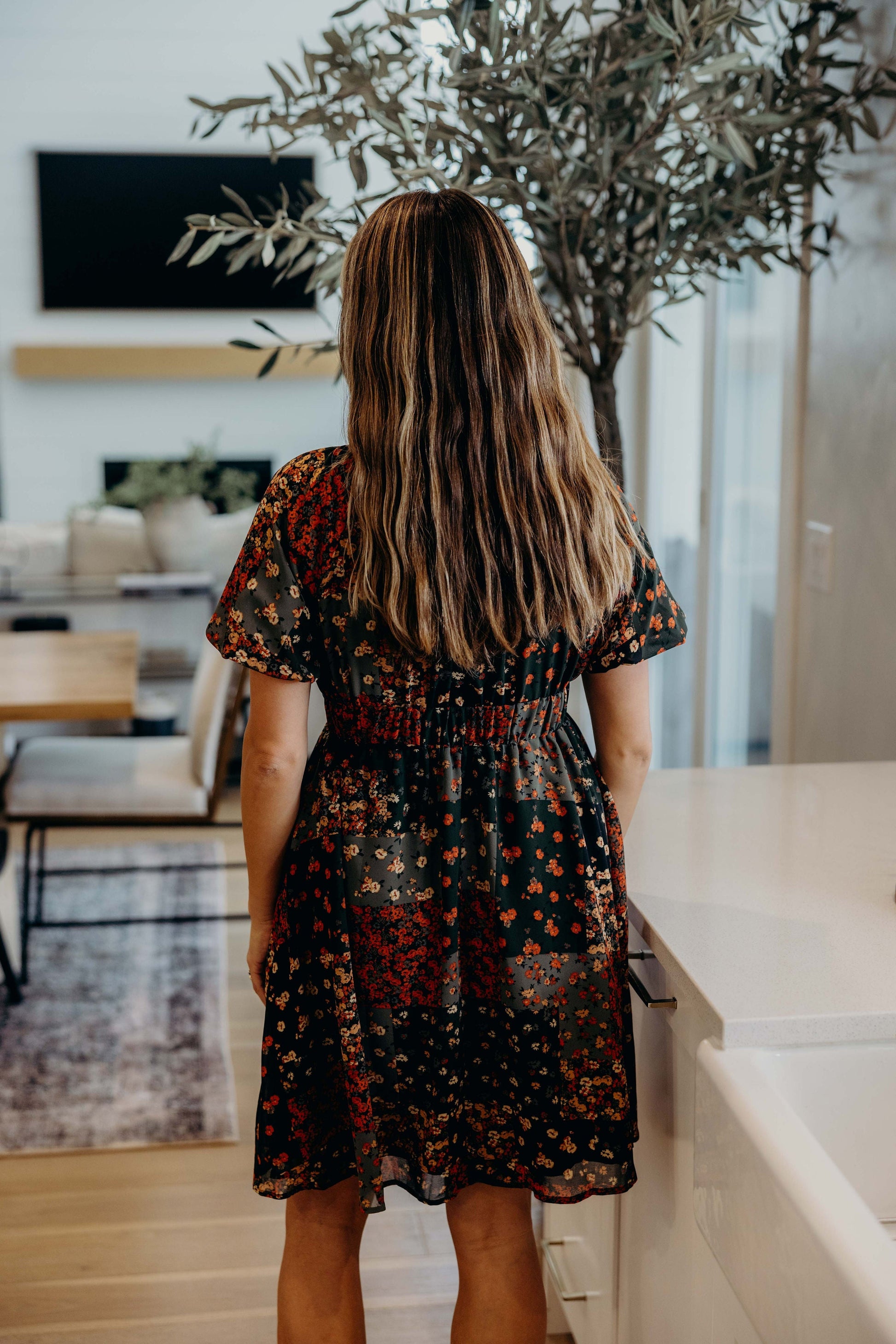 Knee length sheath dress with sweetheart neckline, empire waist, elastic waist in back, puff sleeves and pockets.