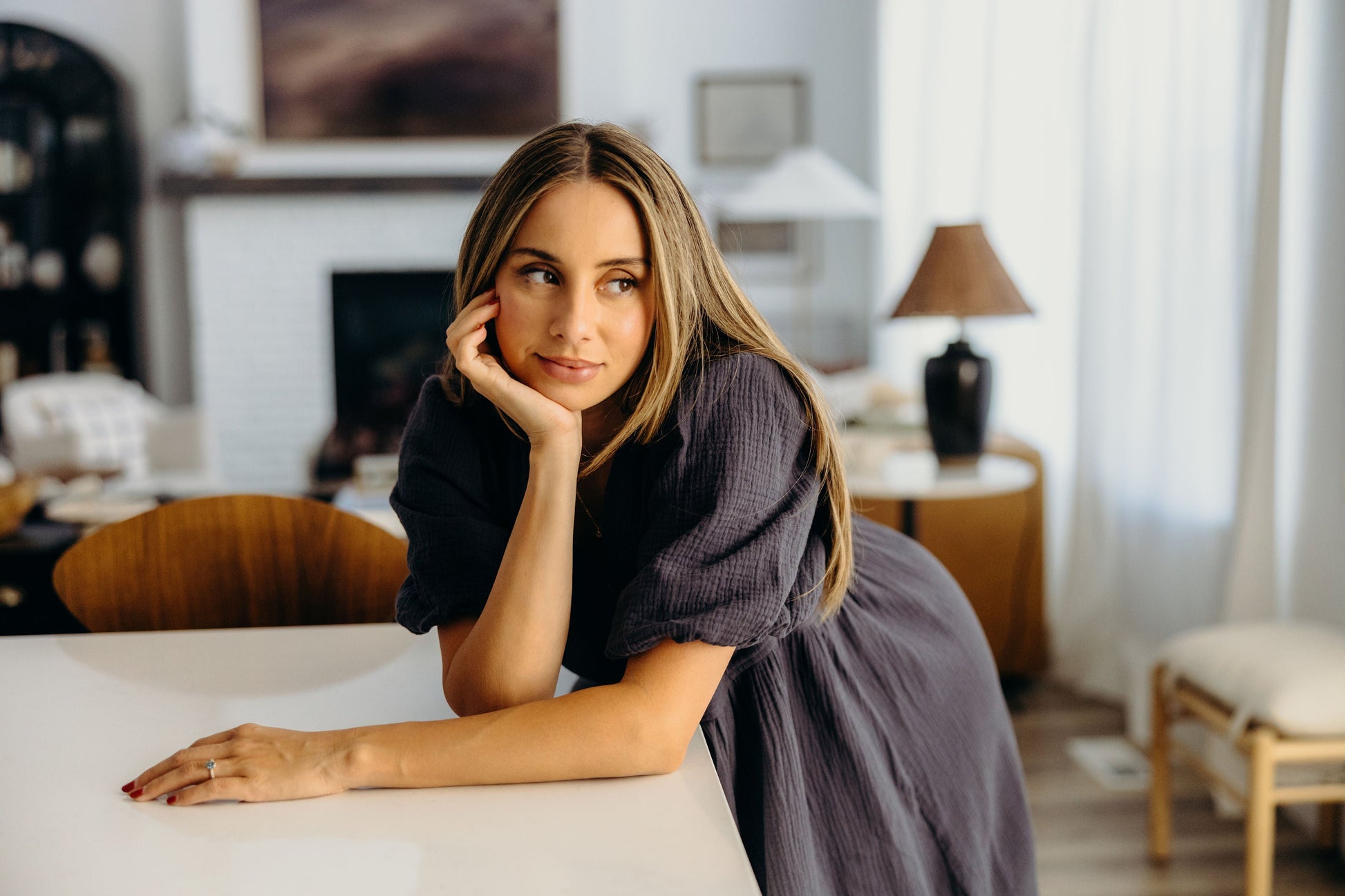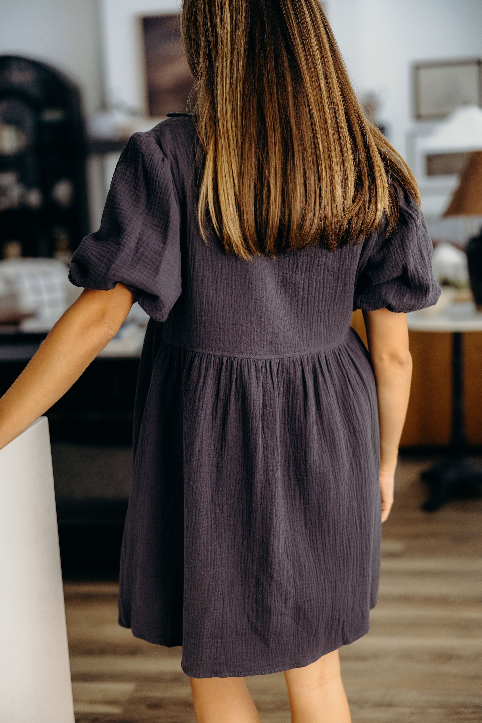 ?Knee length fit and flare dress with button-down detail, v-neckline, and bubble sleeves.