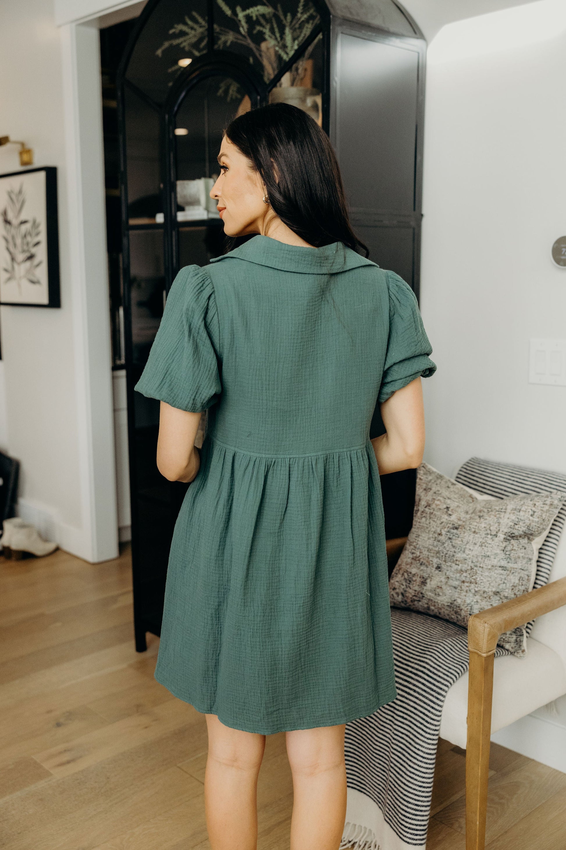 ?Knee length fit and flare dress with button-down detail, v-neckline, bubble sleeves and pockets.