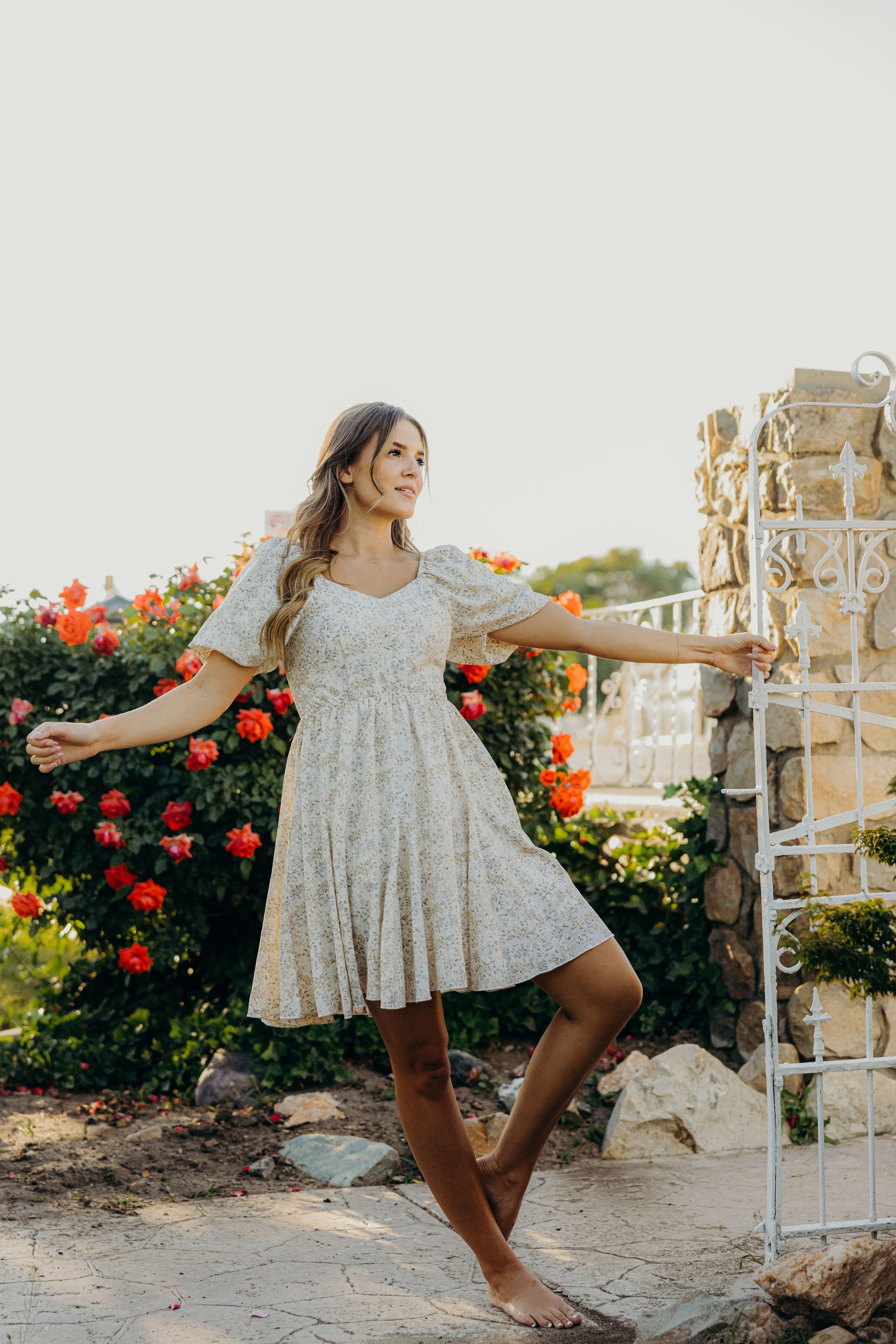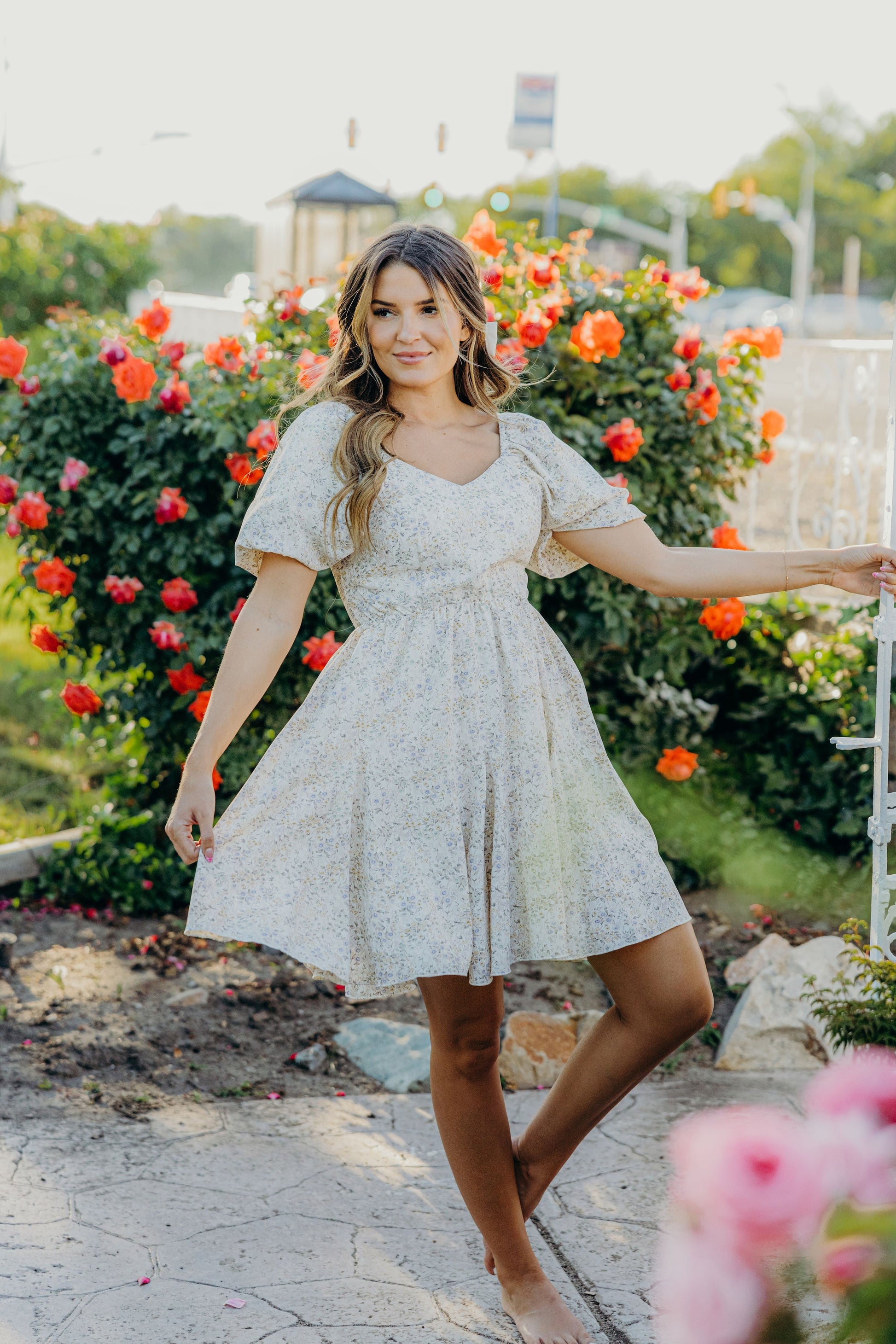 Knee Length dress with sweetheart neckline and puff sleeves.