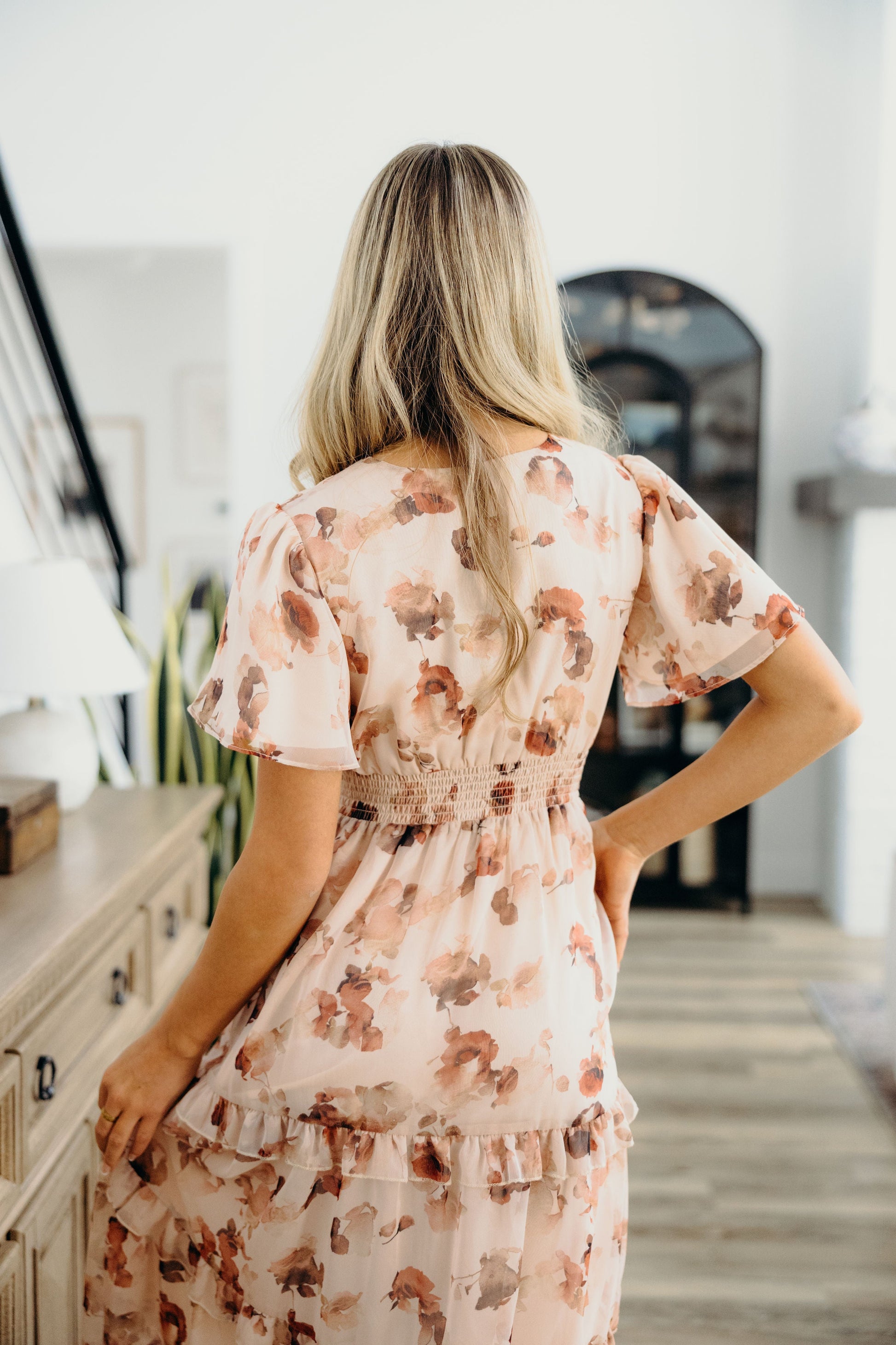 Midi length dress with natural waist, tiered skirt, v neckline, flutter sleeve and faux wrap detail.