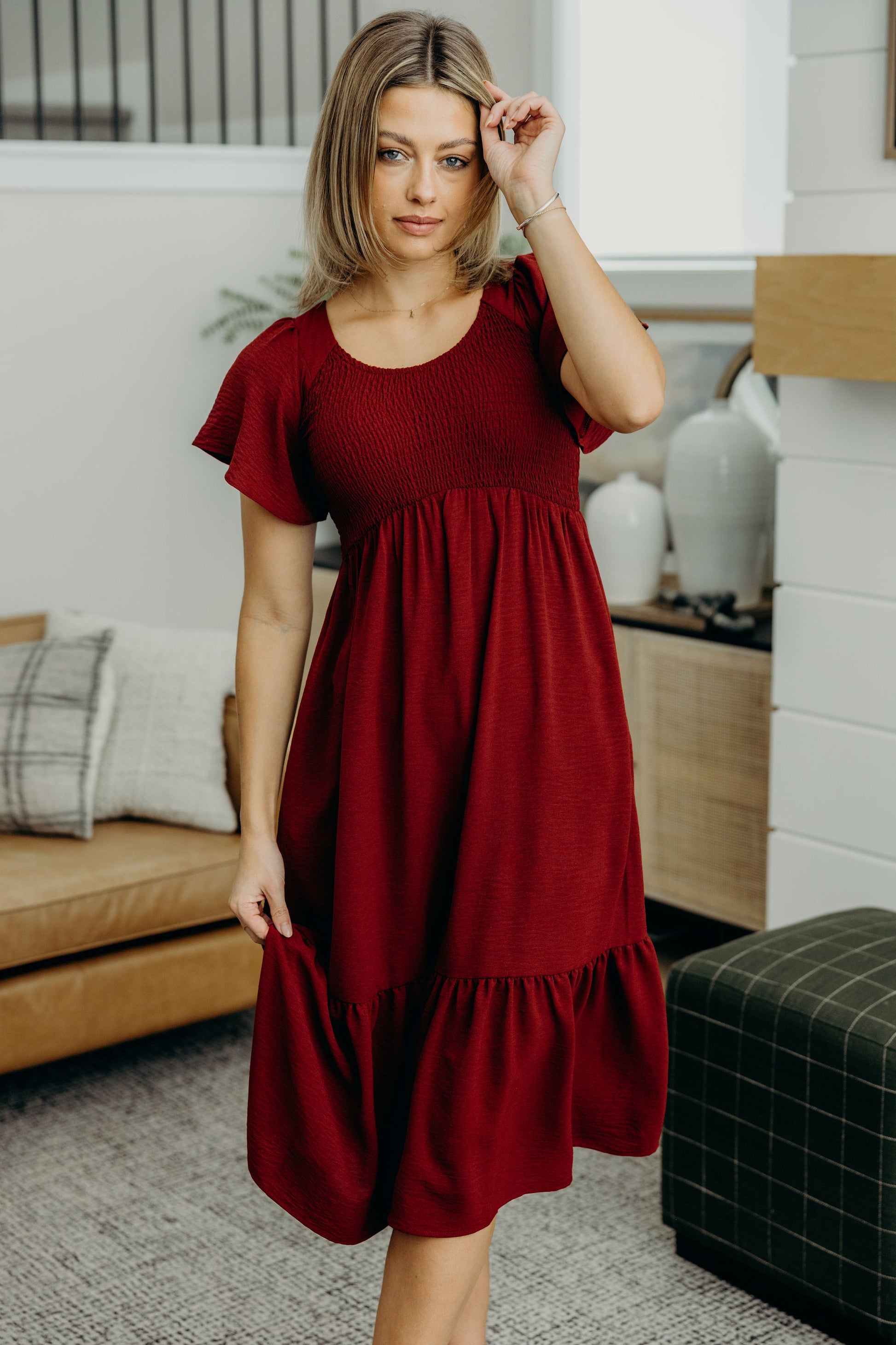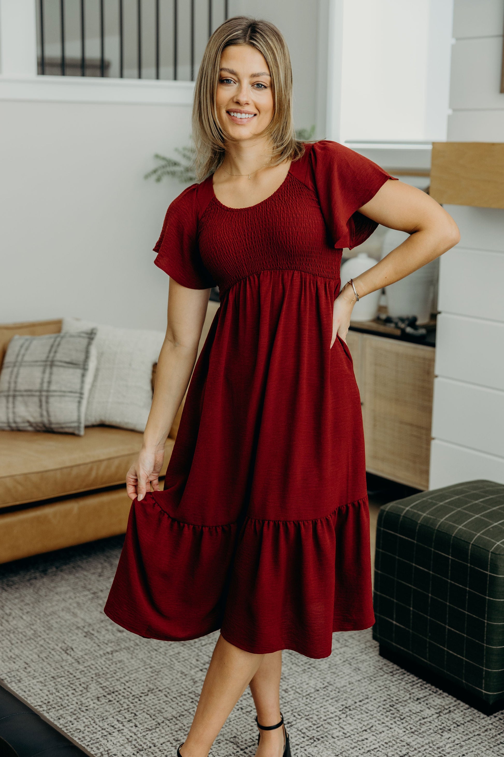Midi length dress with ruffle hem, smocked bodice, v neckline, and flutter sleeves.