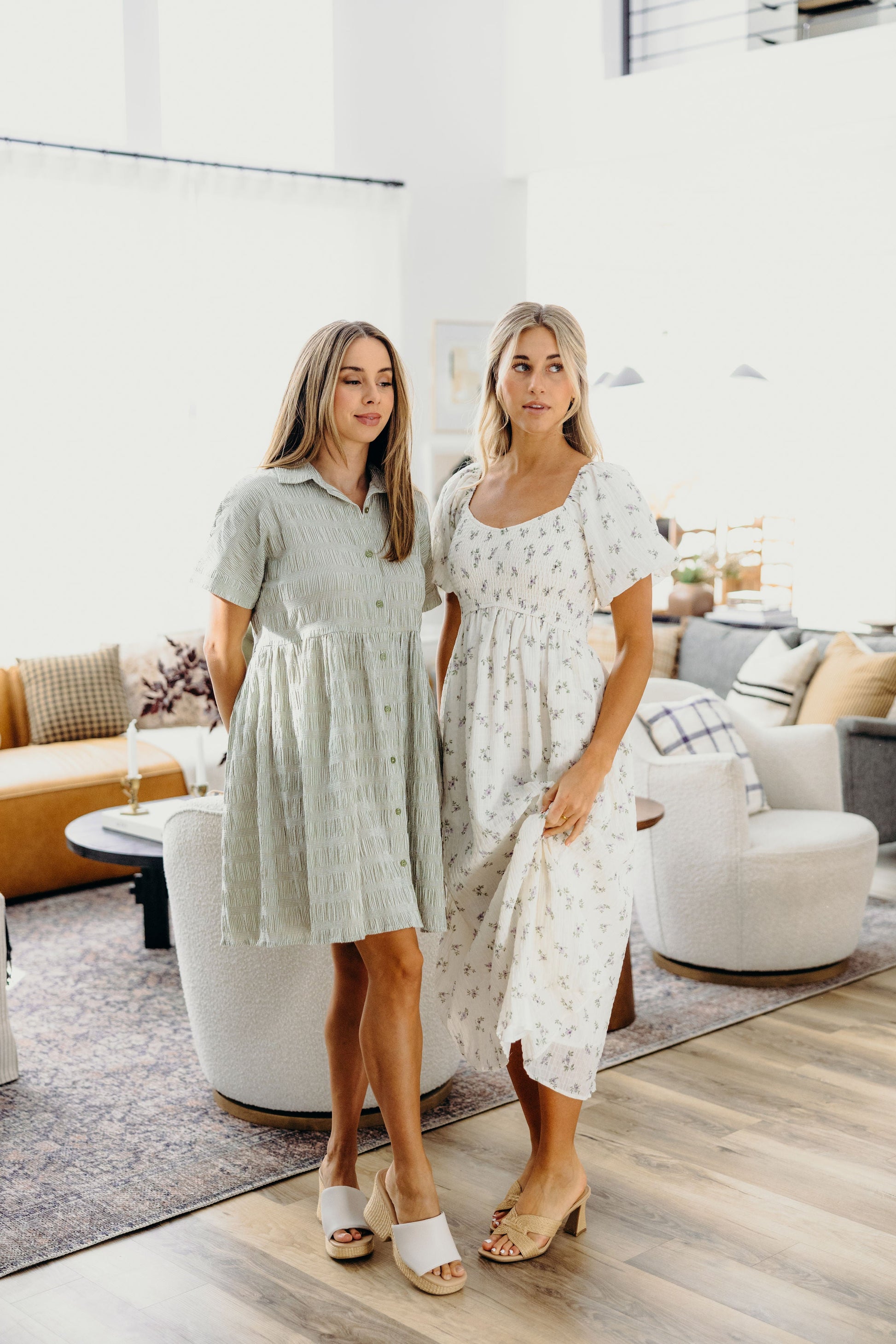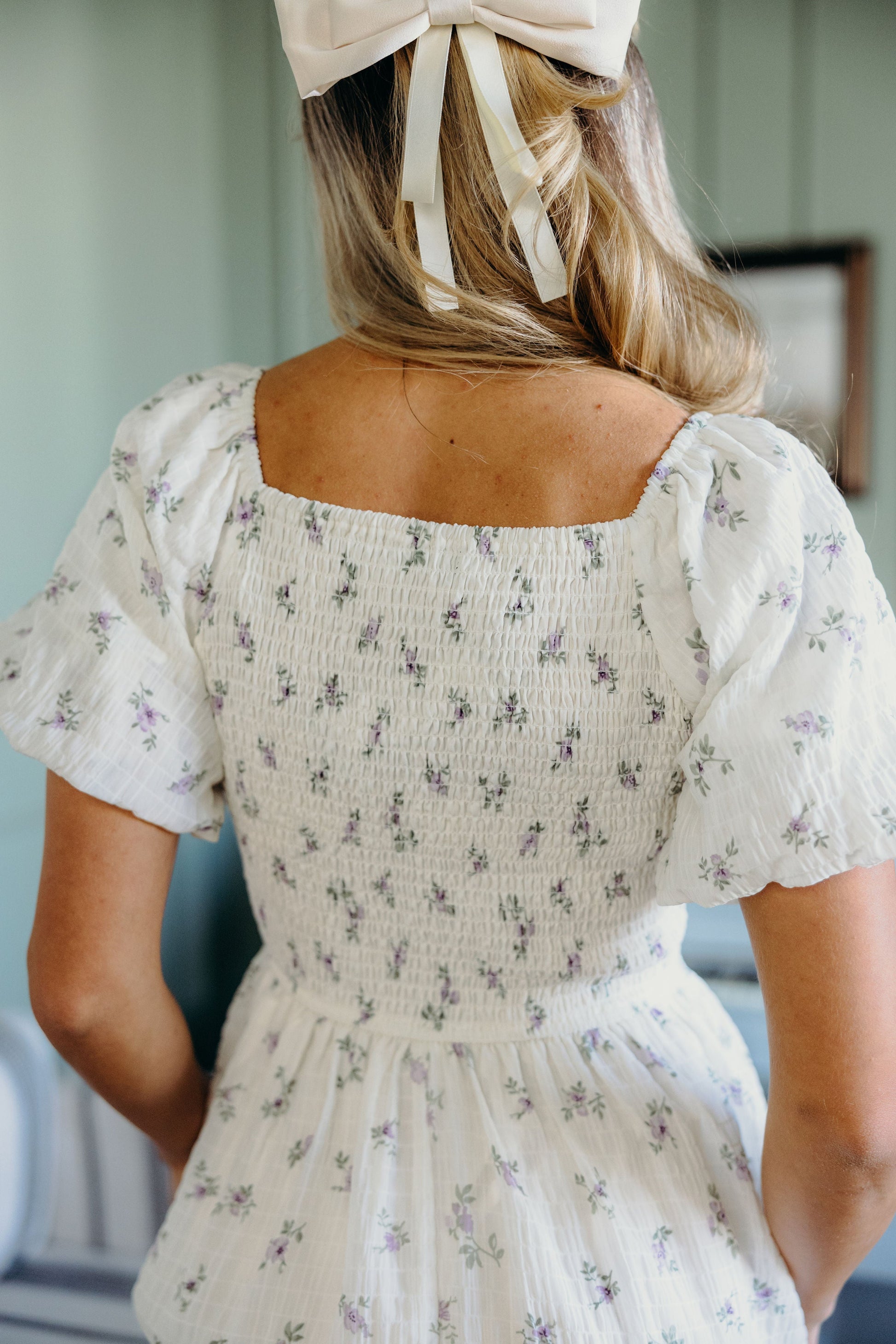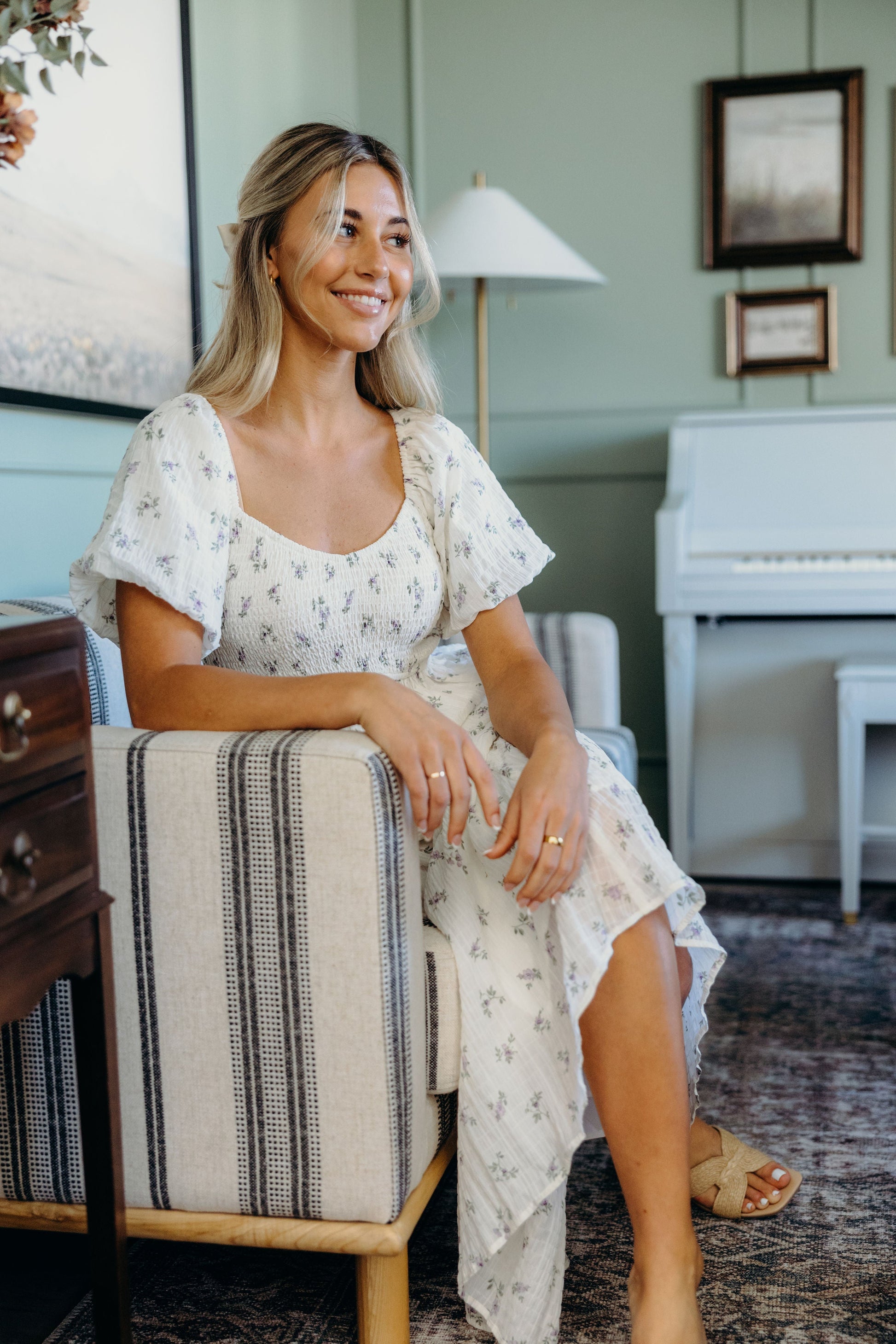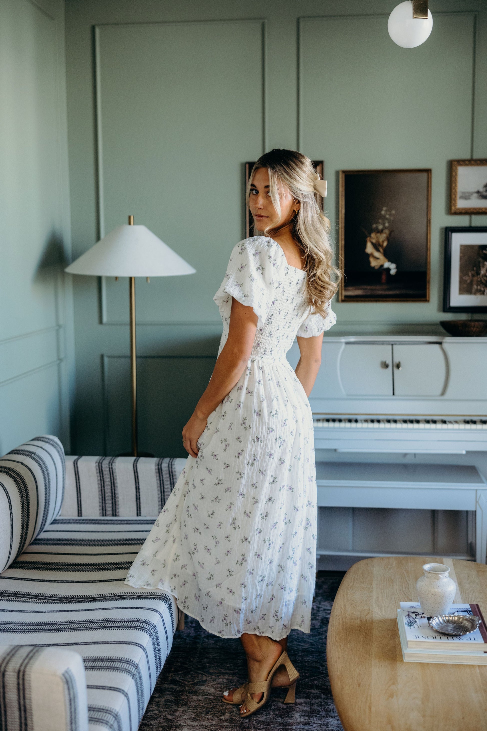 Maxi length dress with natural waist, smocked bodice, v neckline, and puff sleeves.