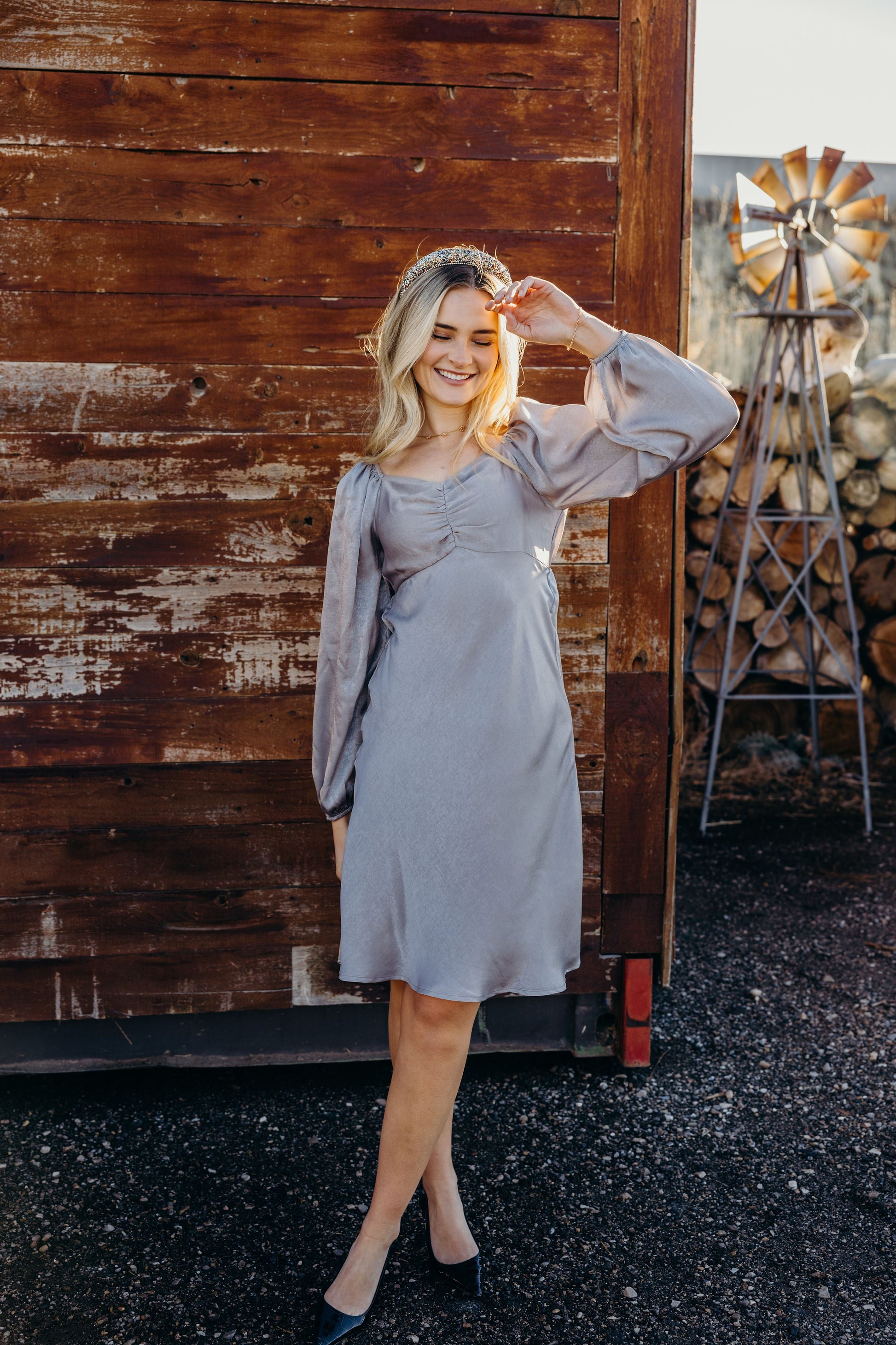 Knee length sheath dress with sweetheart neckline and long sleeves with elastic cuffs.