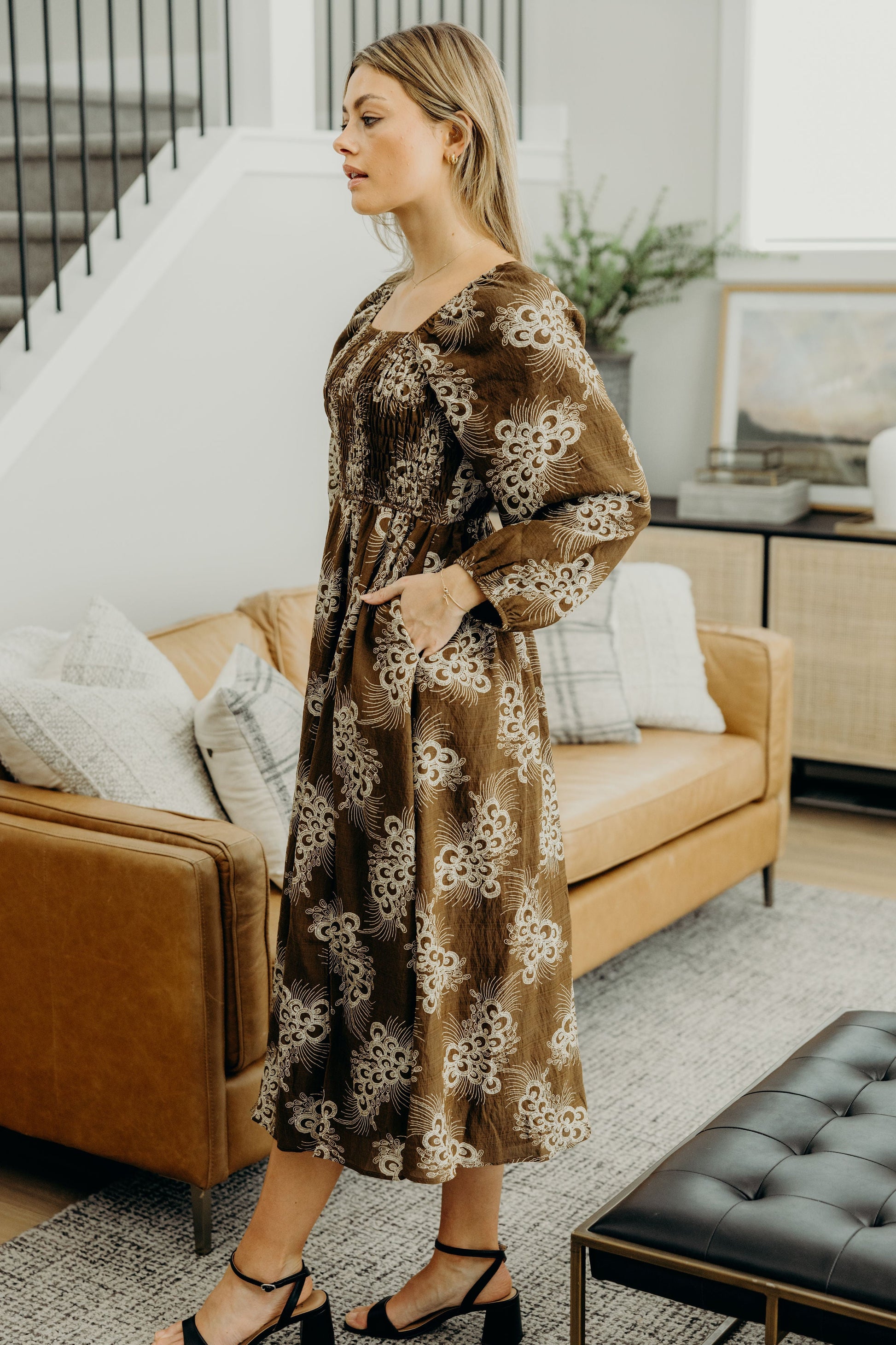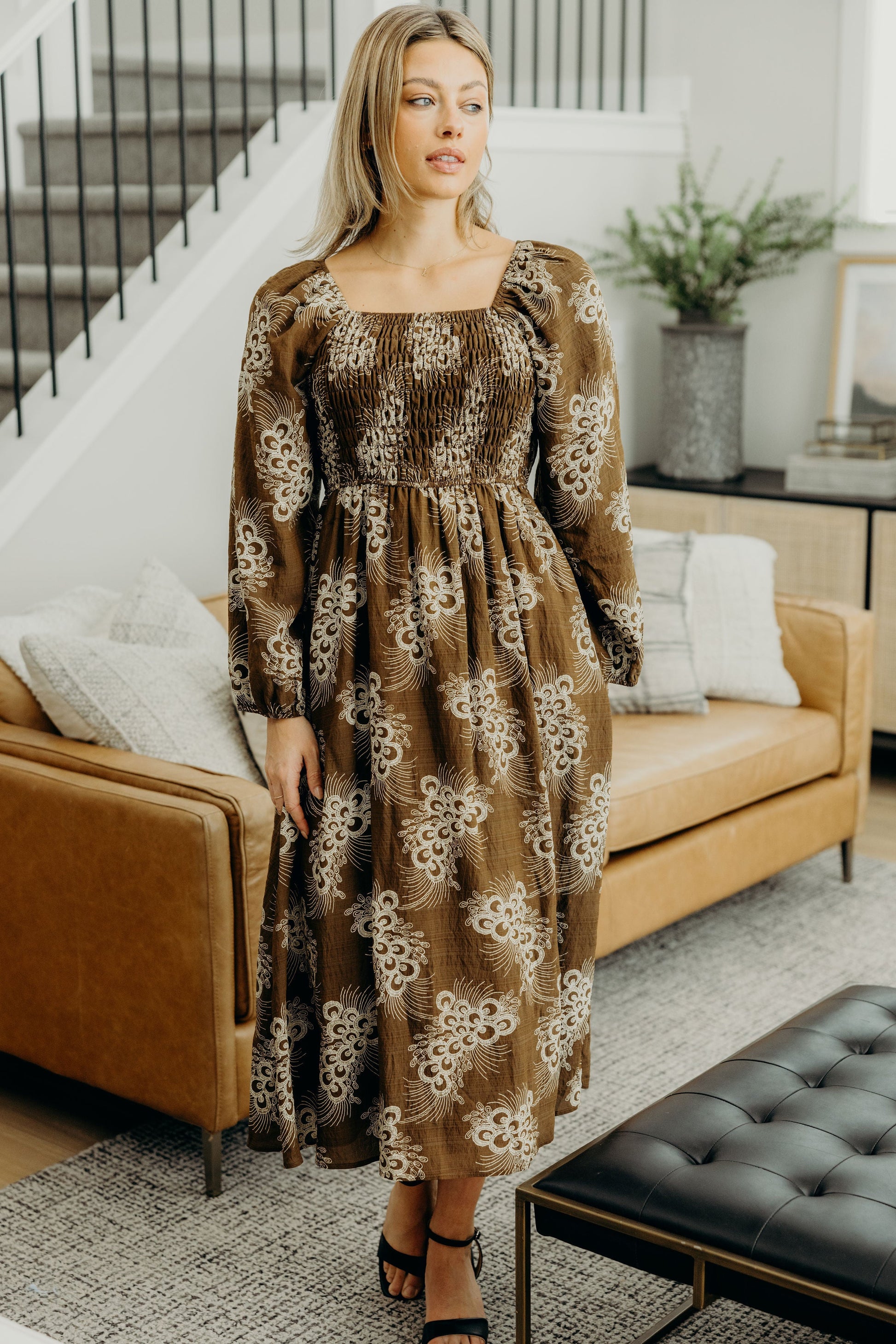 Mid-length dress with square neckline, smocked bodice, and long sleeves.