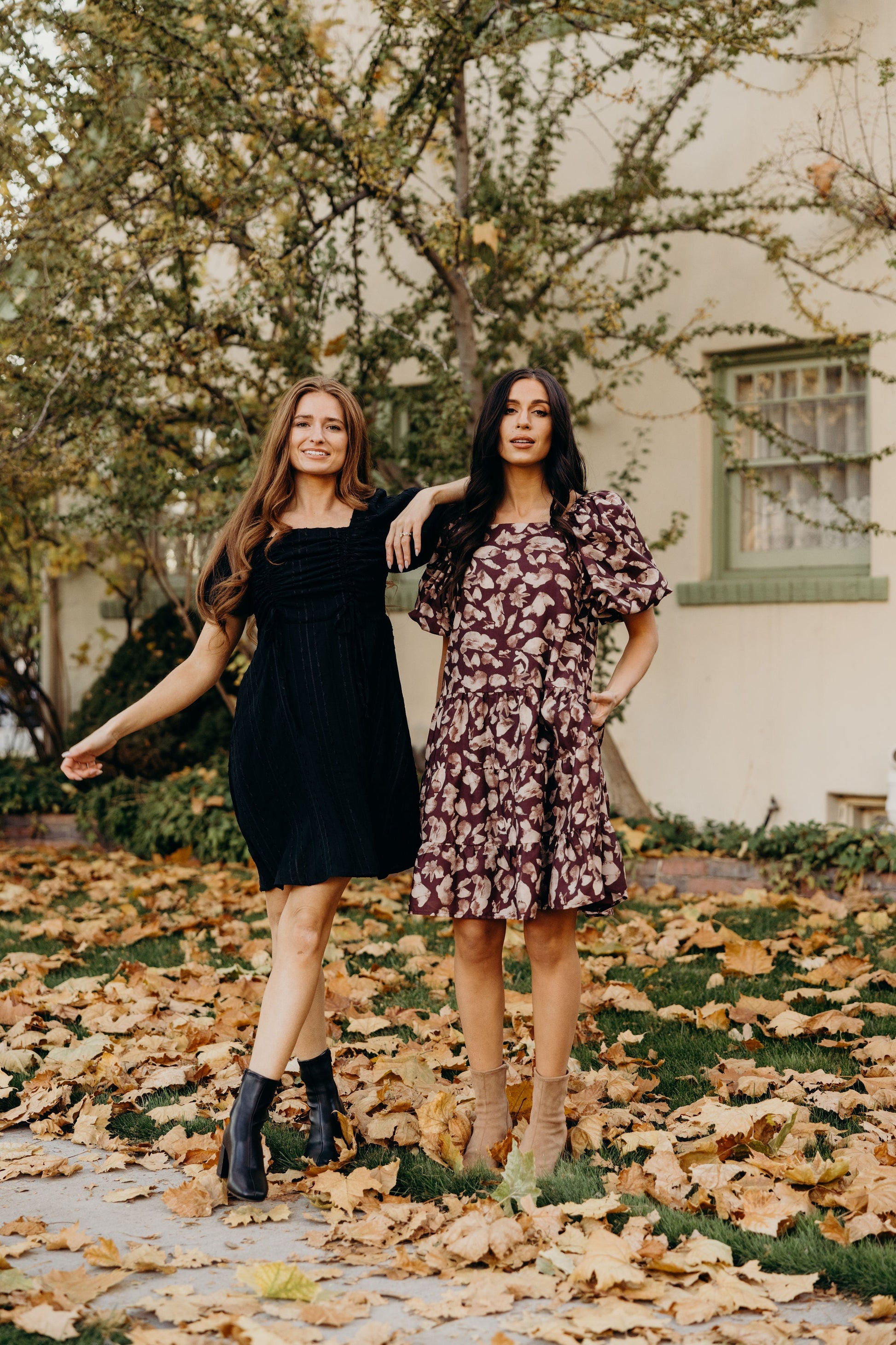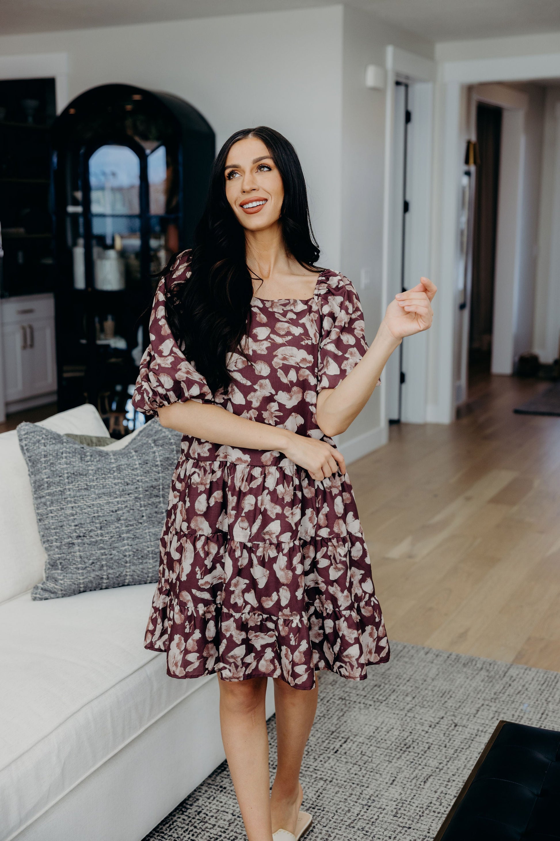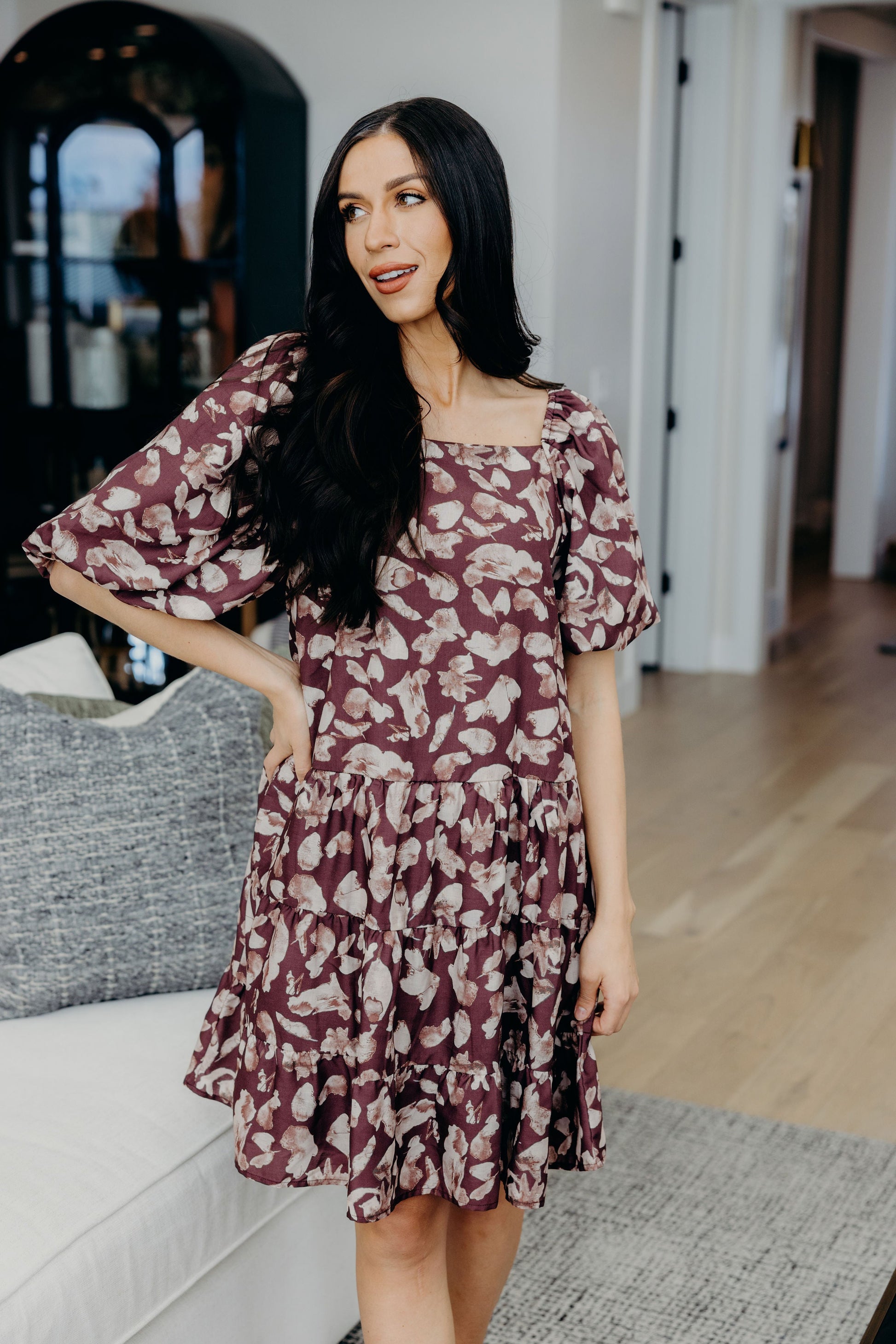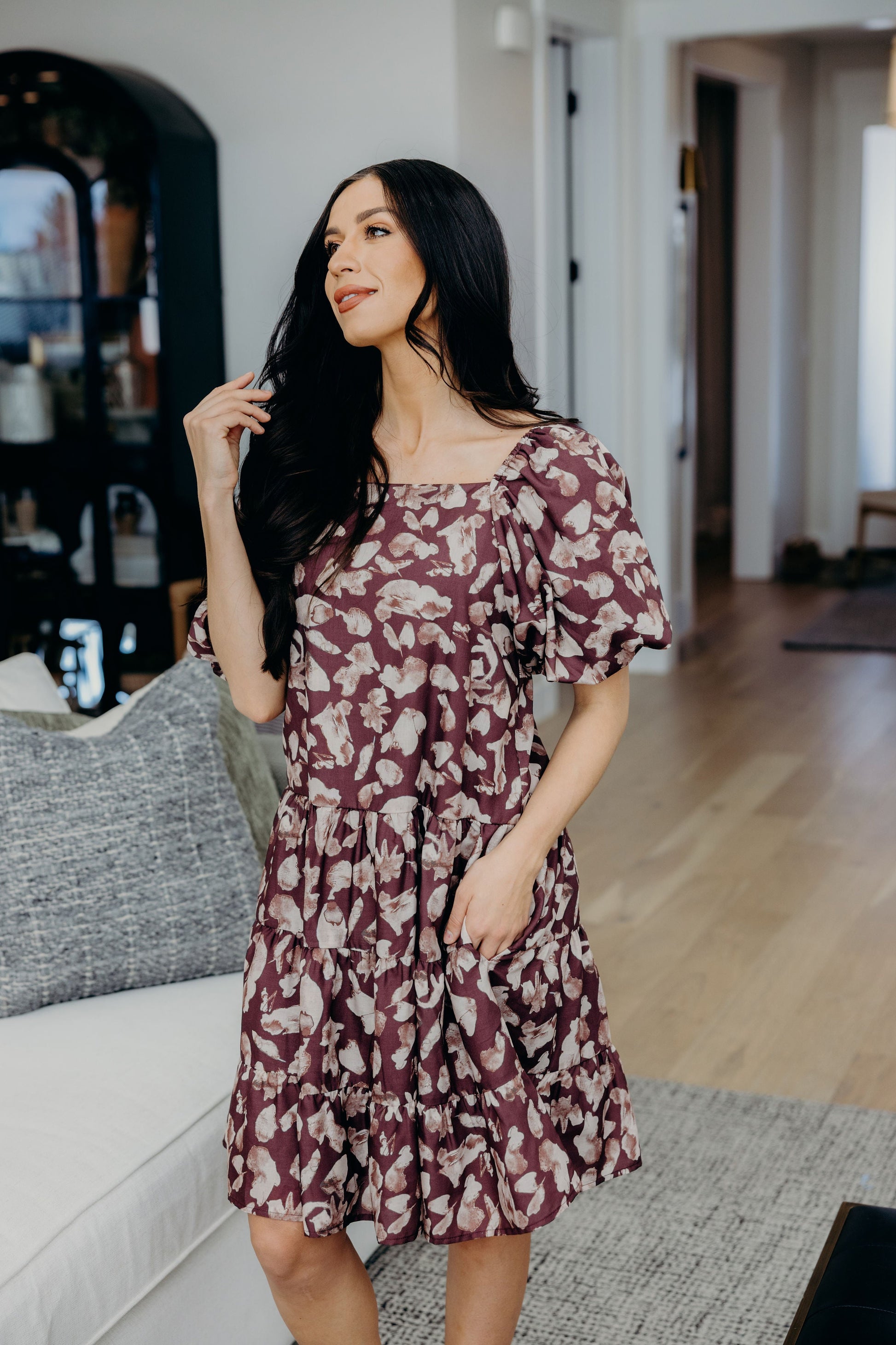 Knee length dress with drop waist, relaxed puff sleeves, and square neckline, and tiered skirt.