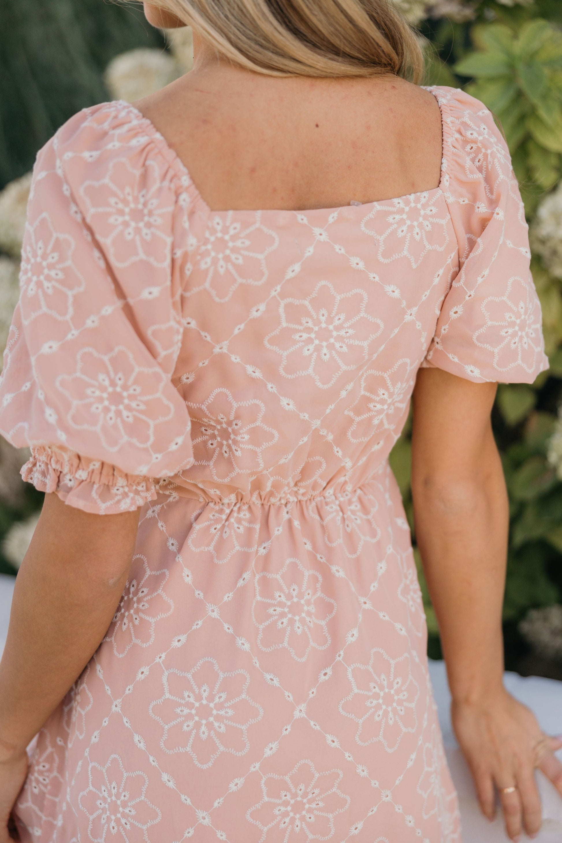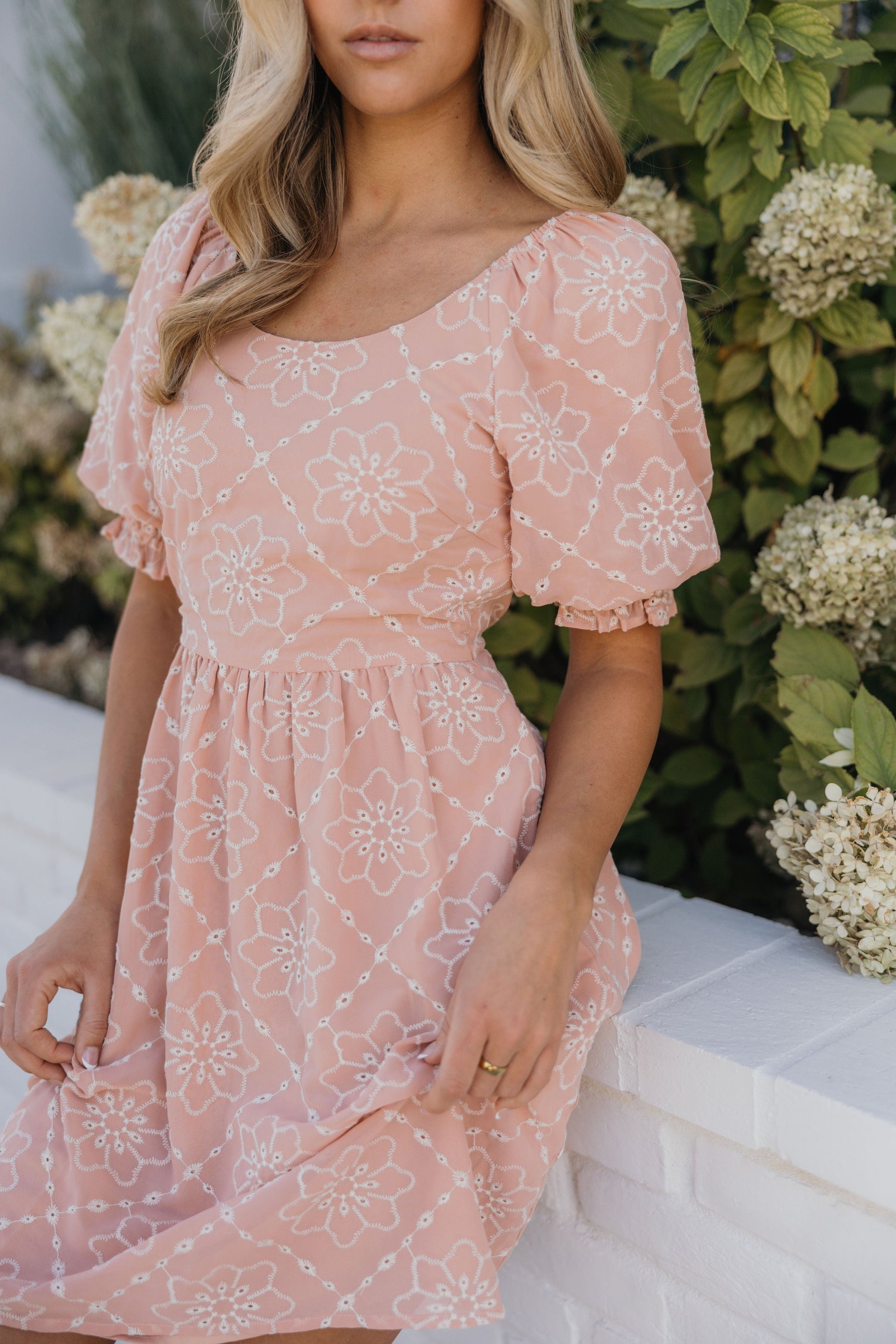 Knee length dress with textured fabric, fit and flare silhouette, puff sleeve with ruffle detail, round neckline, elastic in the back, and side zipper.