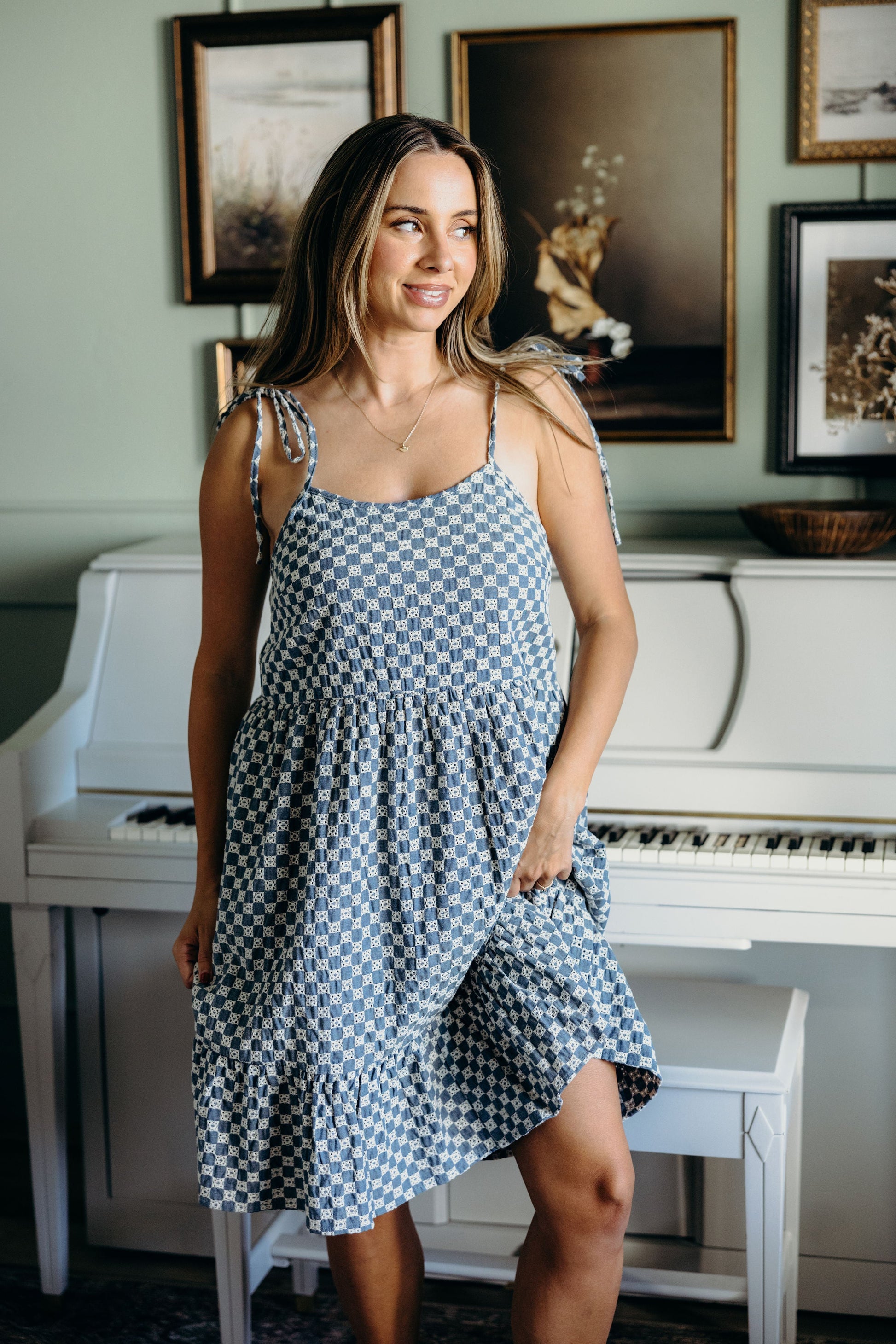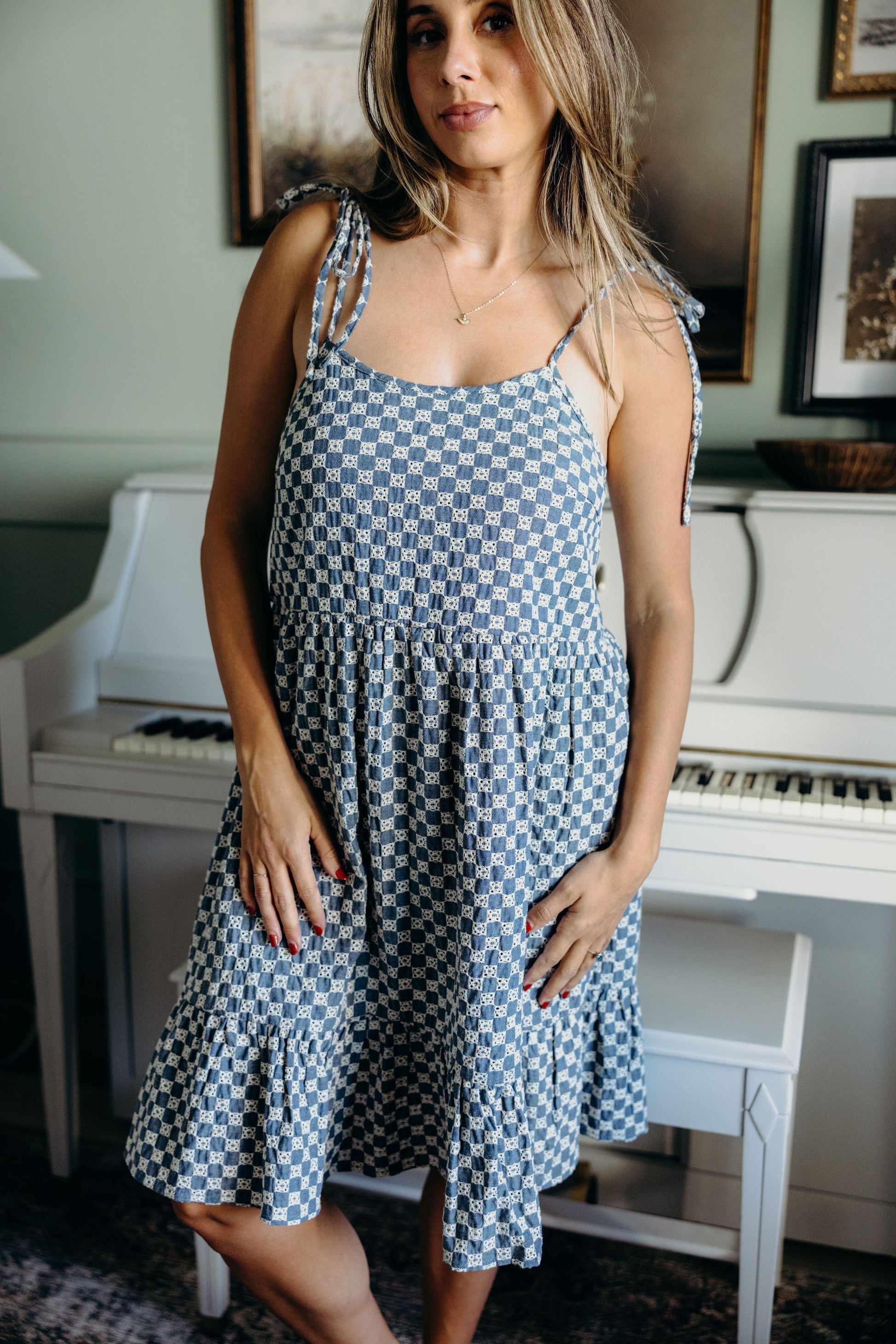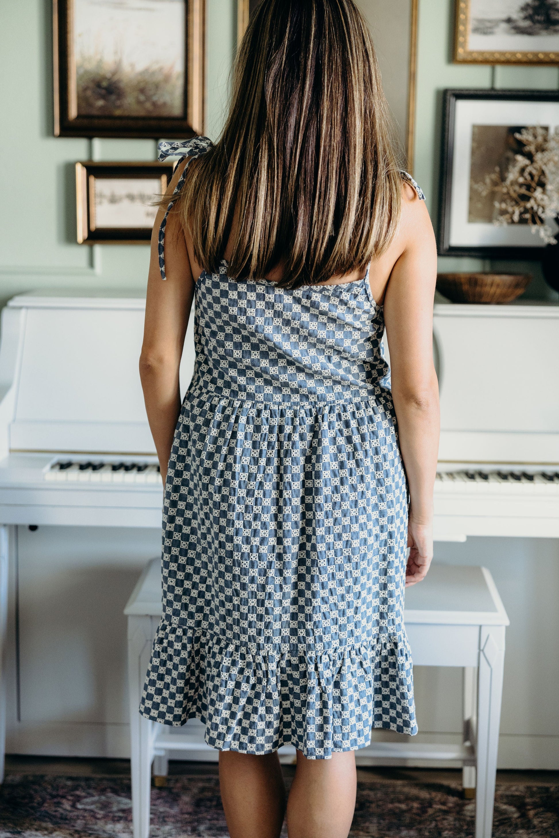 Knee length dress with ruffle hem natural waist, relax silhouette. round neckline and tie shoulders.
