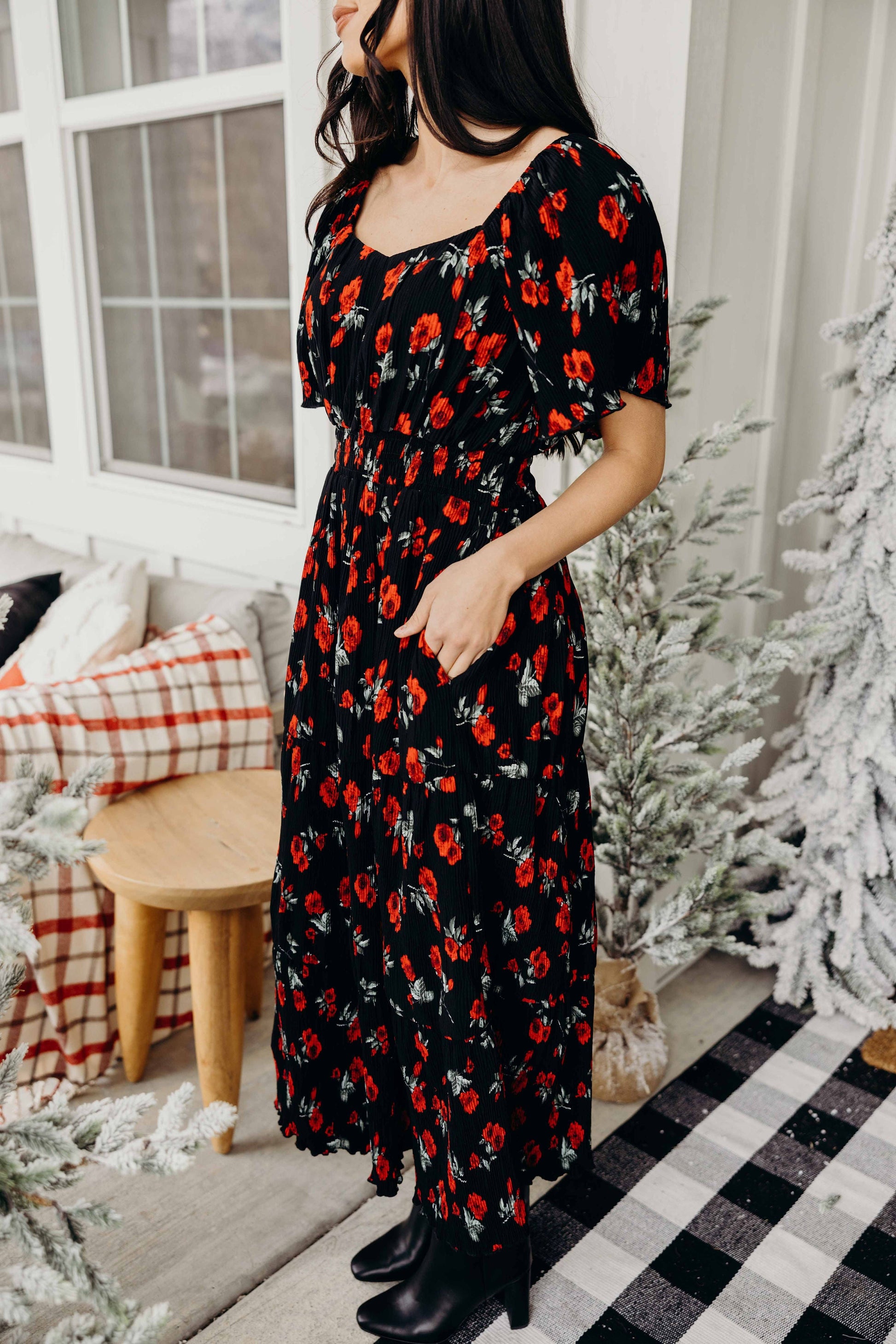 Midi length dress with short flutter sleeves, square neckline, smocked waist, ruffle hem, and pockets.