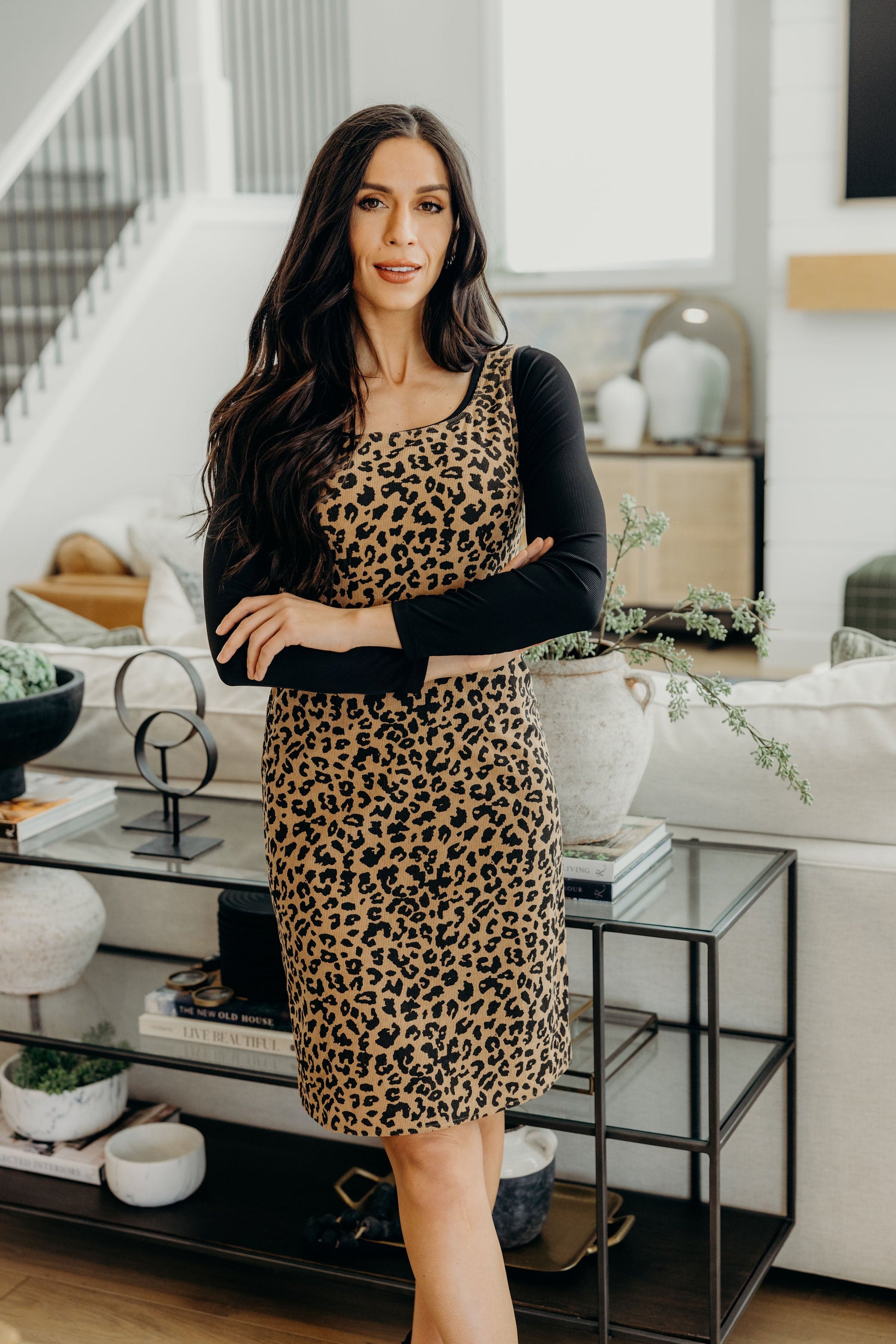 Knee length fitted textured dress with round neckline and zipper closure in back.