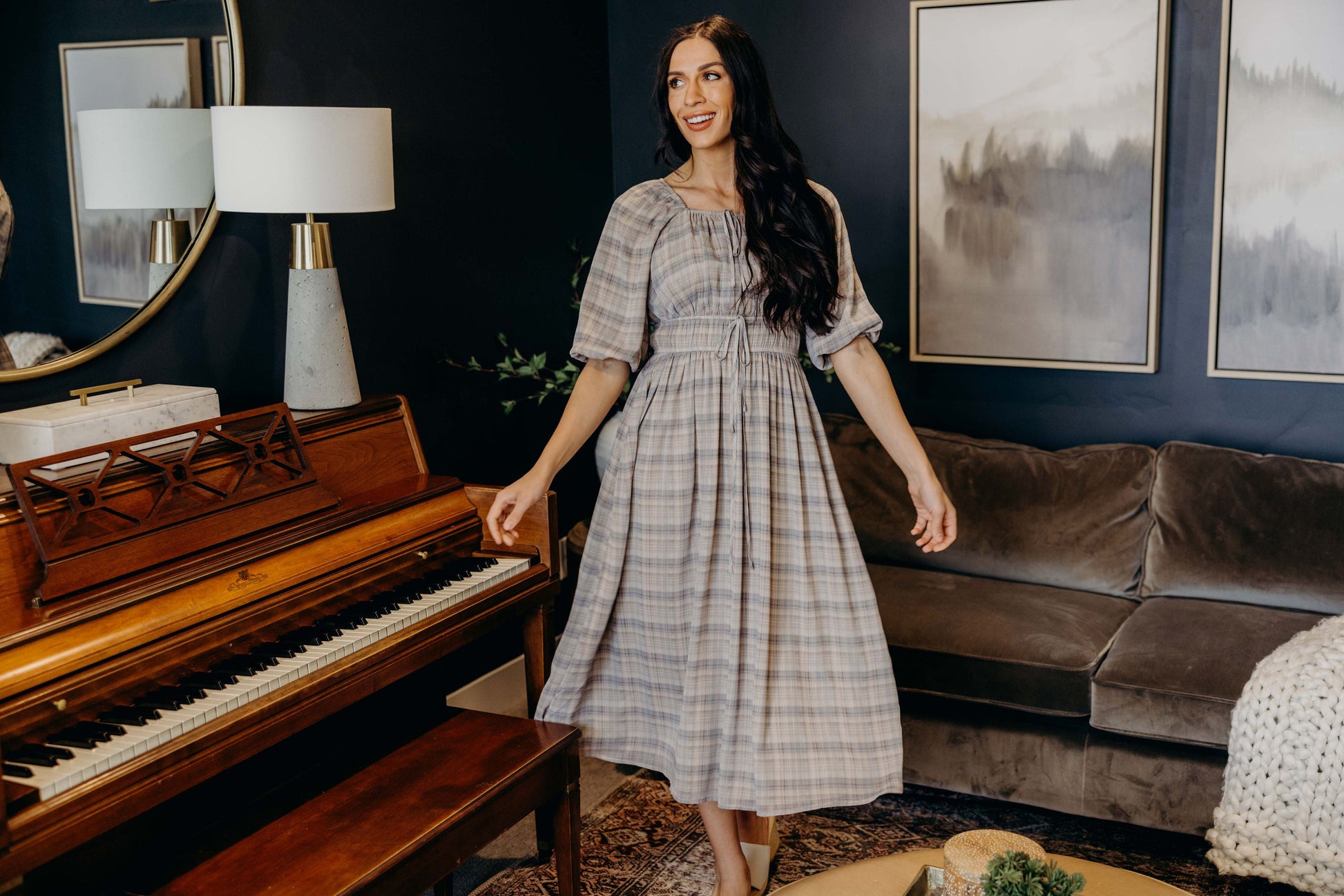 Midi length dress with a line silhouette, Square neckline, elastic waist, 3/4 sleeves, and tie details.