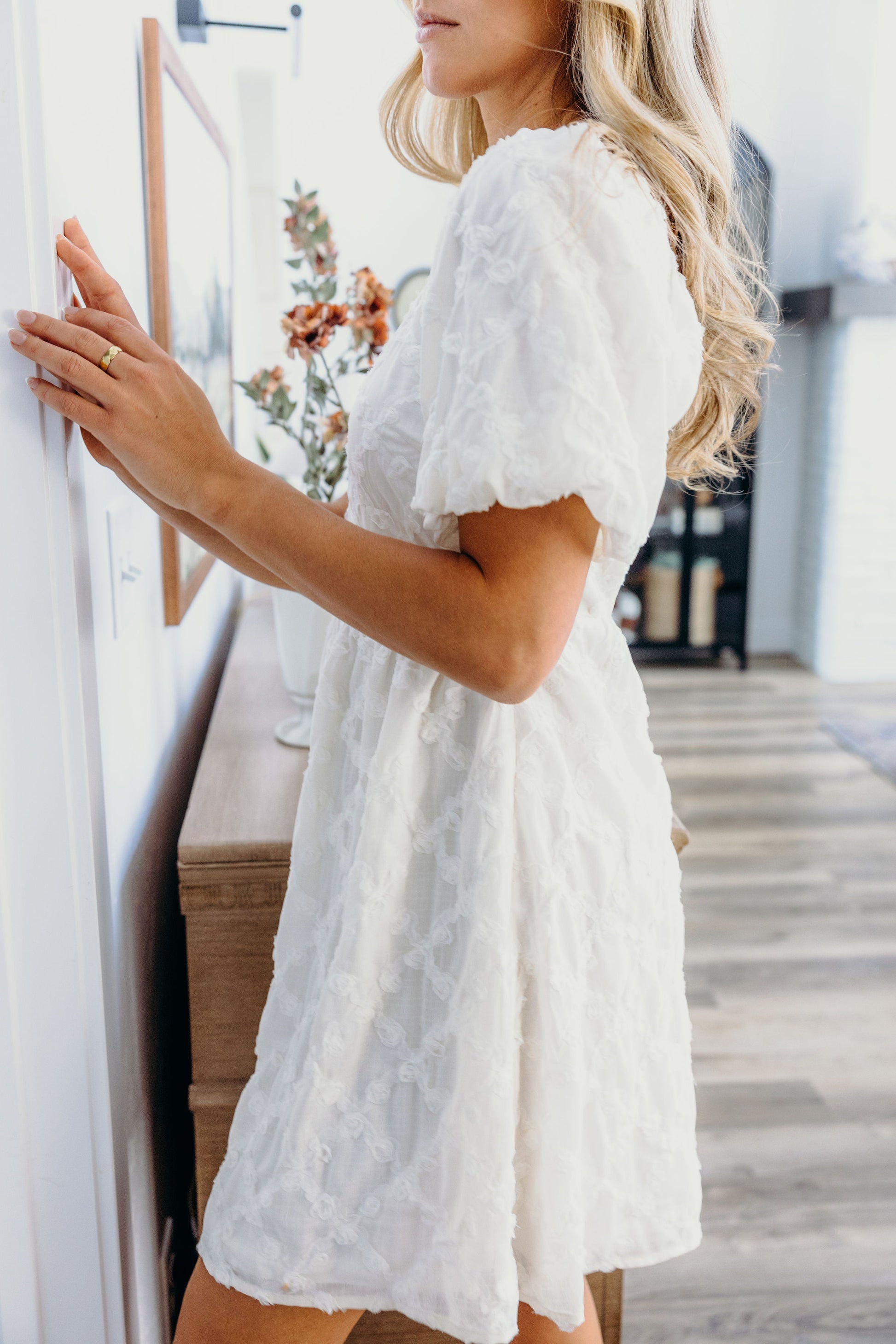 Knee length dress with textured fabric, fit and flare silhouette, puff sleeve, round neckline, elastic in the back, and side zipper.