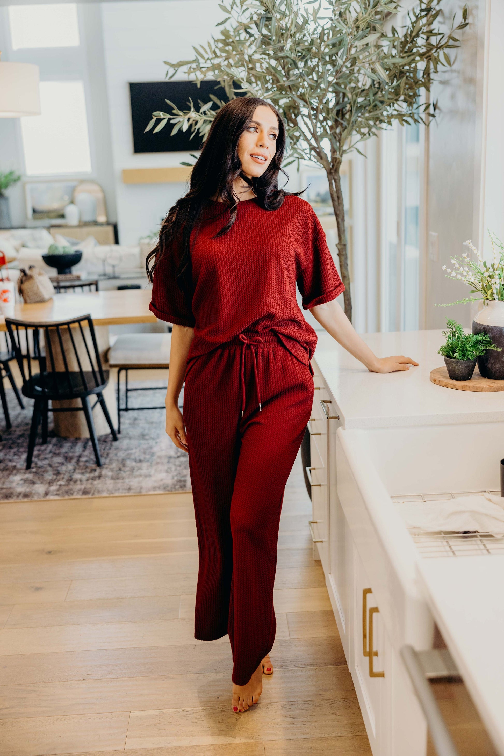 Full length pants with texture detail with elastic waistband, tie detail, and pockets.