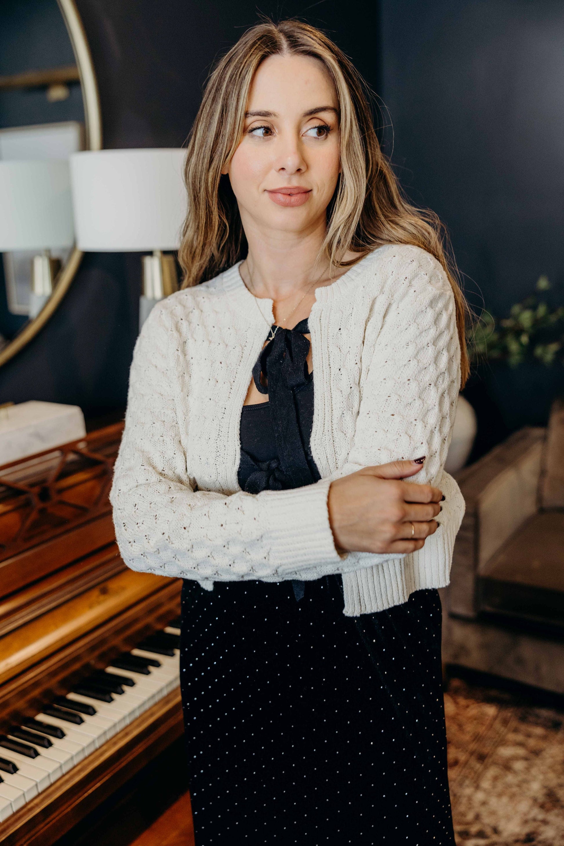 Long sleeve cardigan with decorative cable knit, velvet ties, and round neckline.