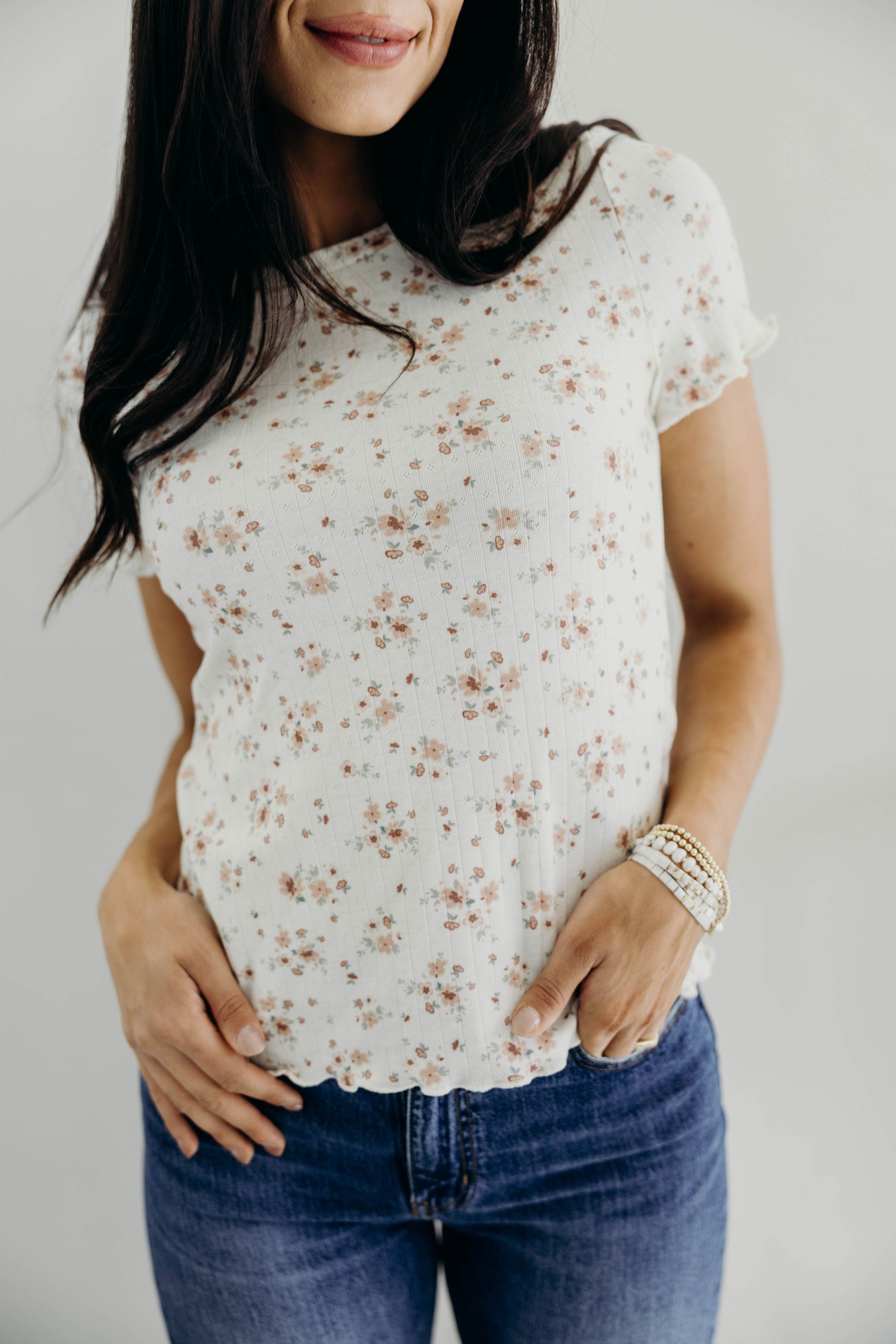 Short sleeve tee with crew neckline and lettuce hem detail.