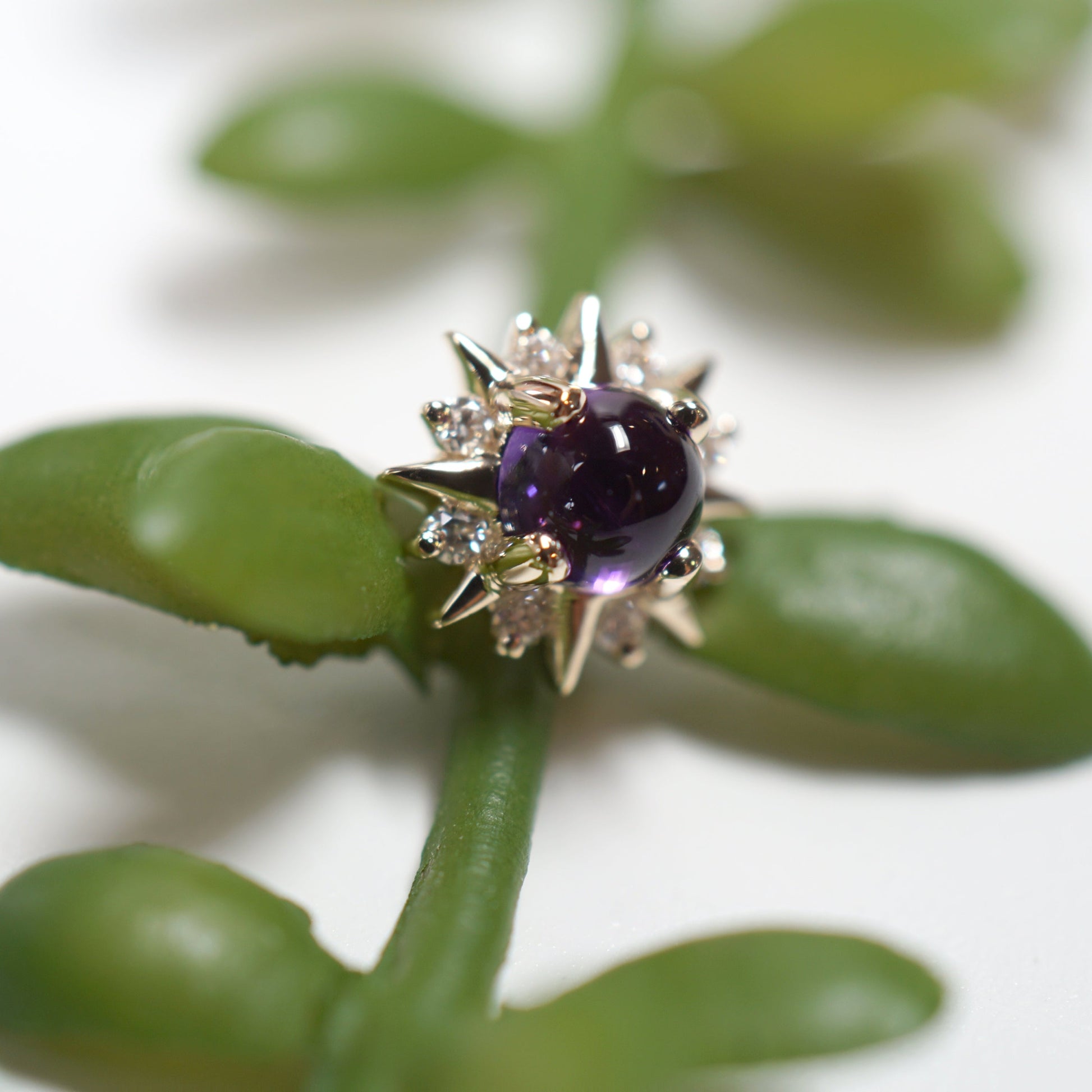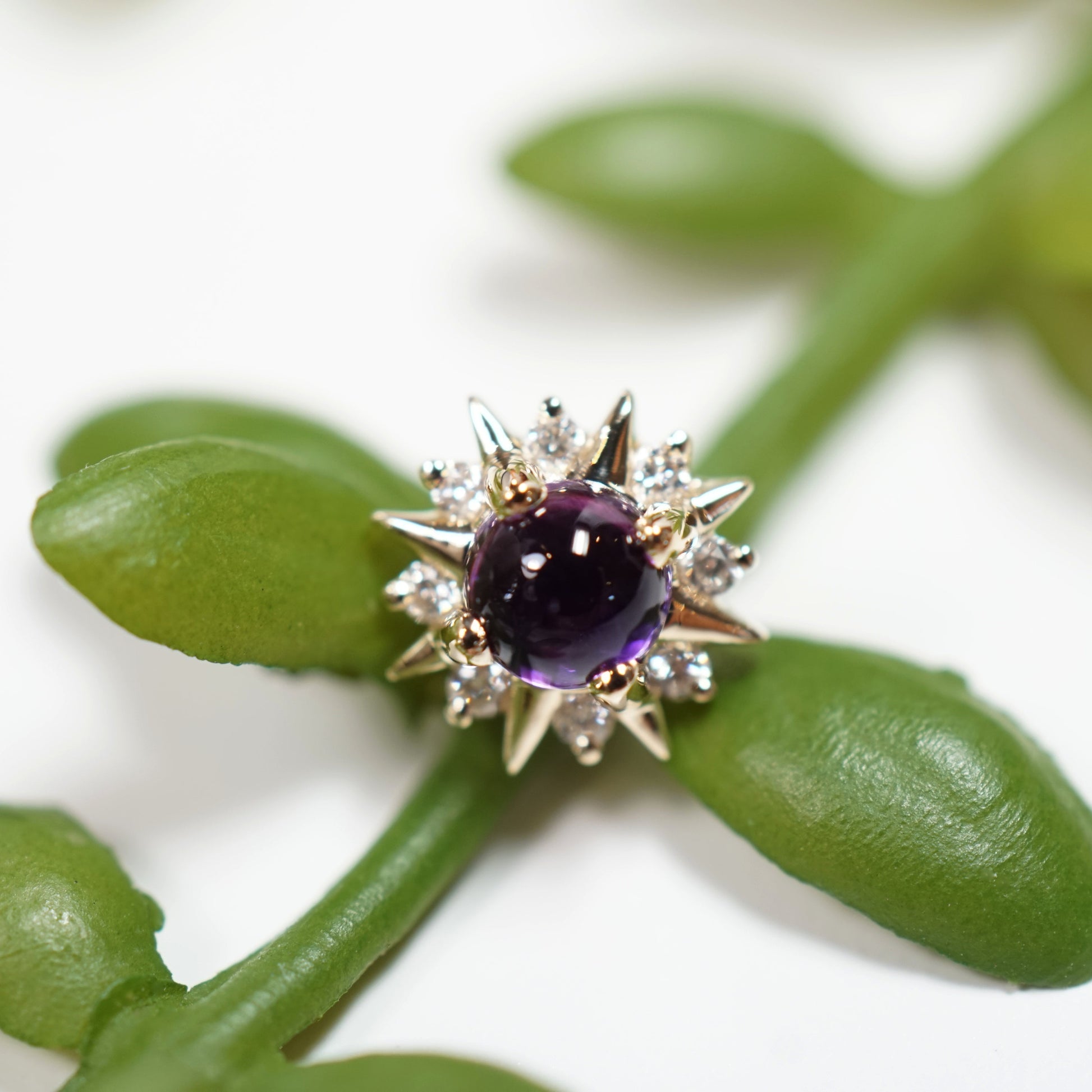 Cabochon gemstone in the center surrounded by 8 alternating gold rays and genuine diamonds