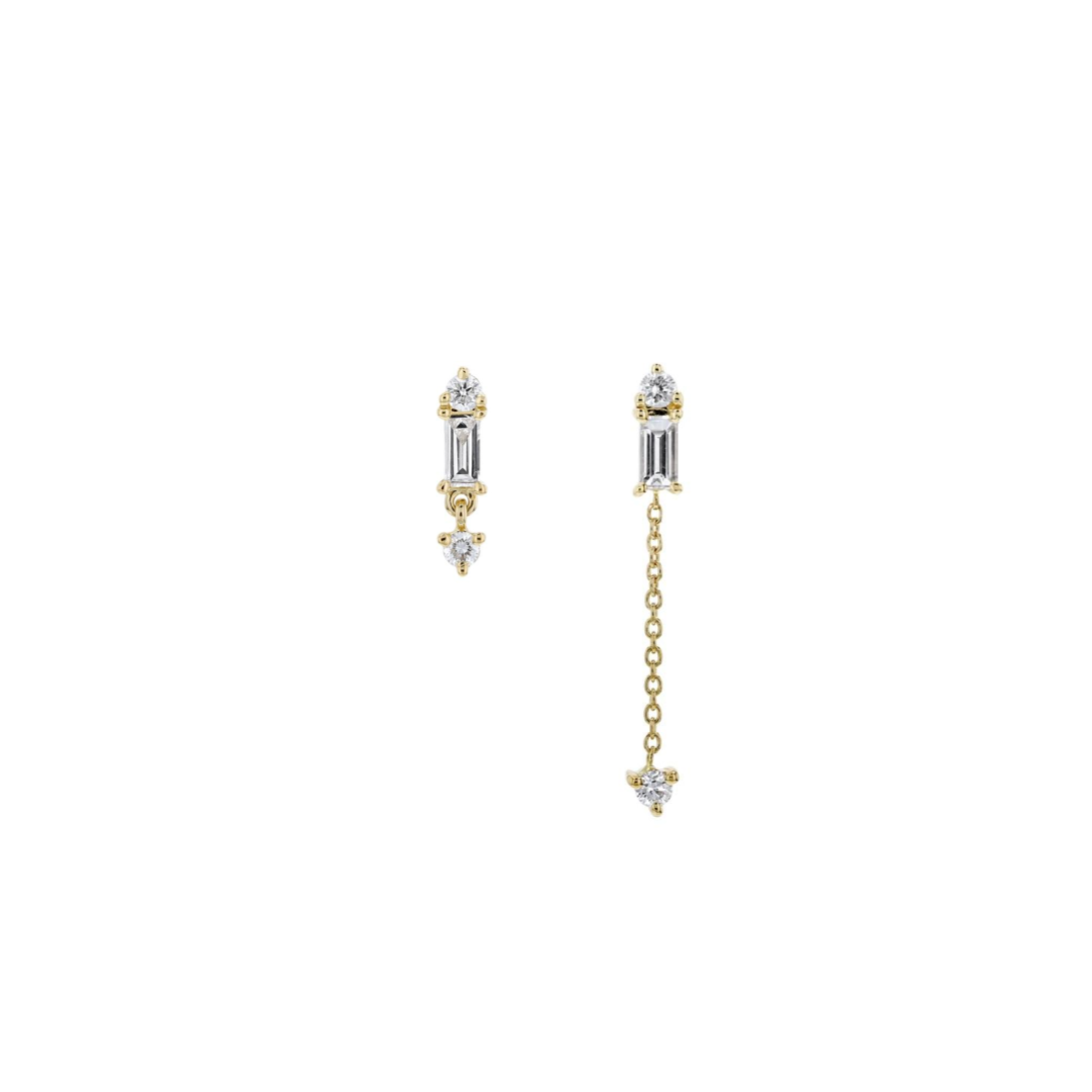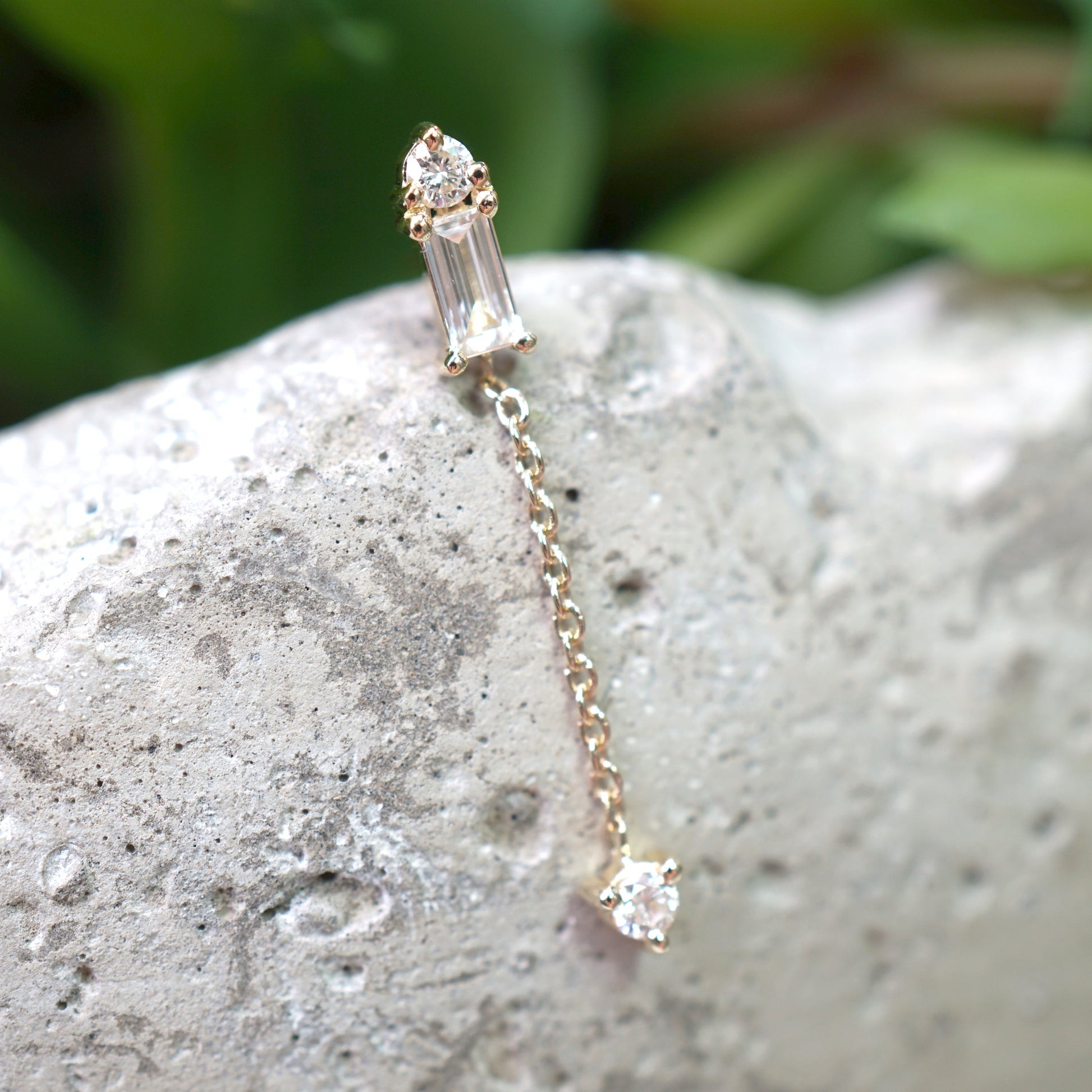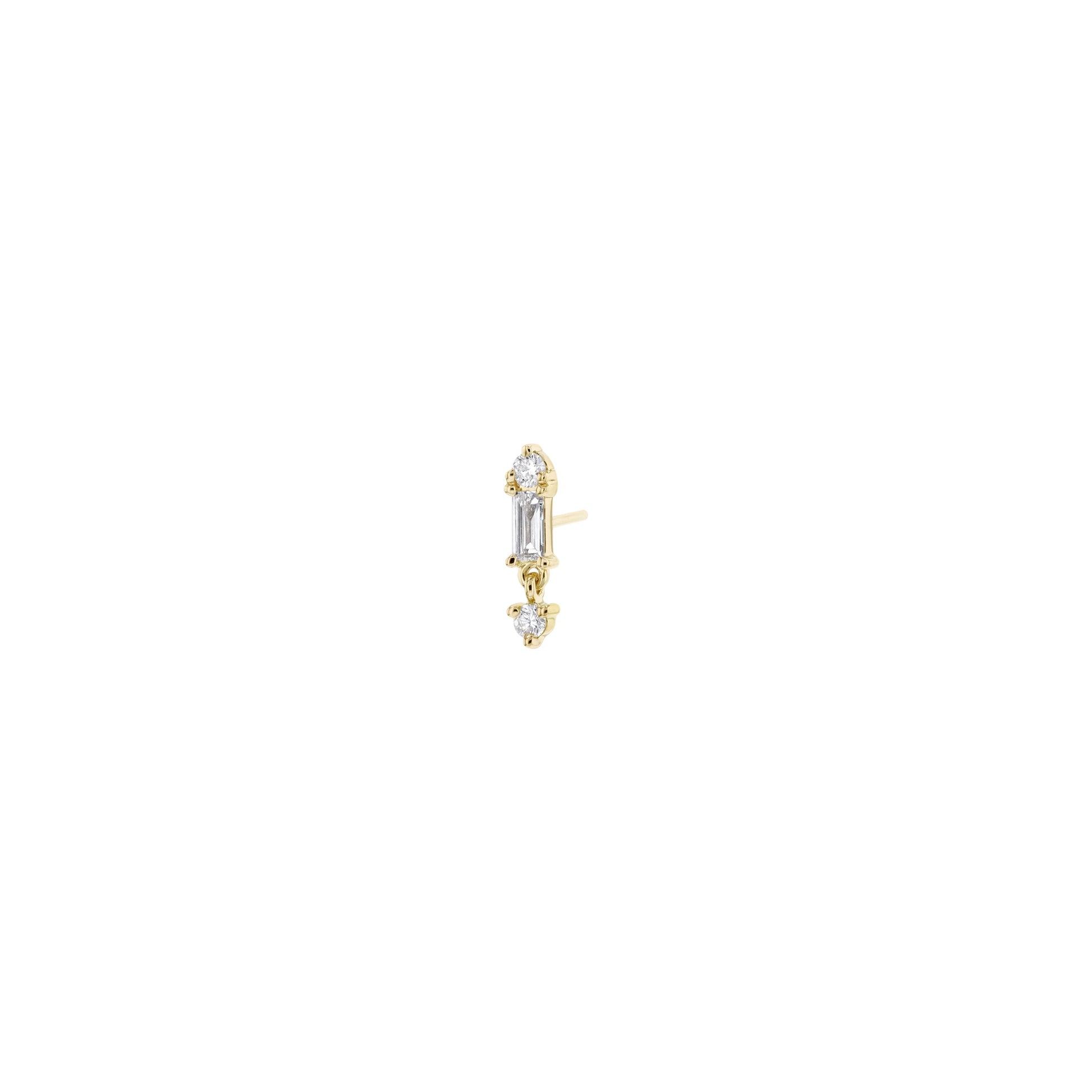 Baguette diamond accented with one round diamond above and another round diamond dangle