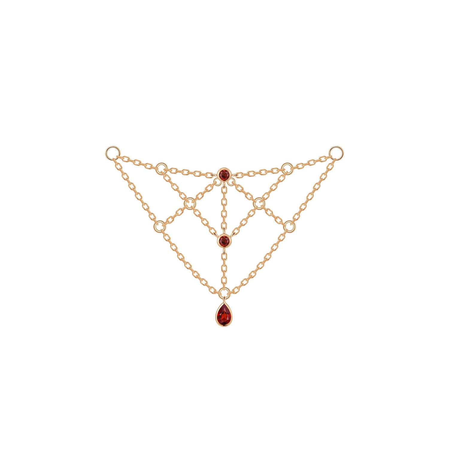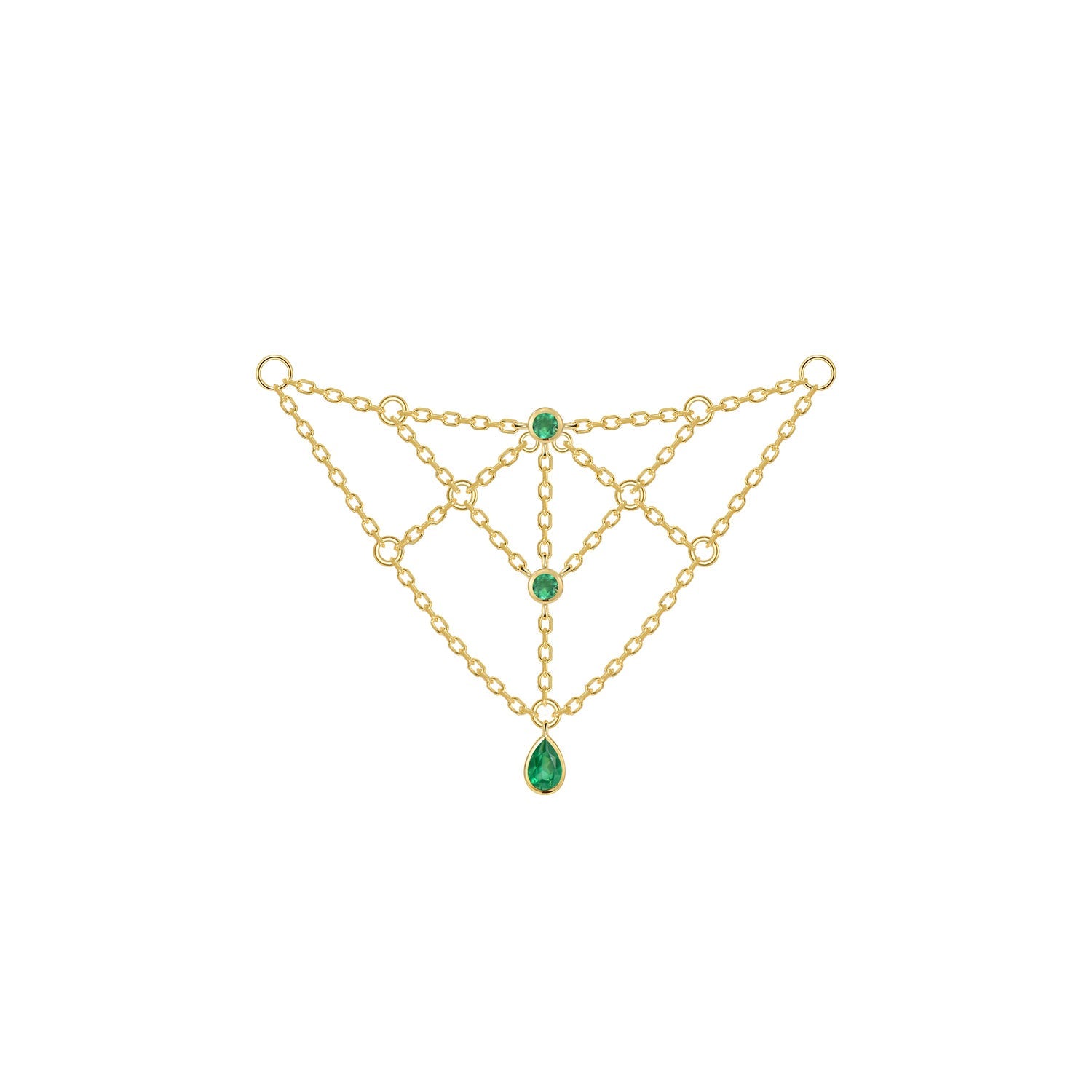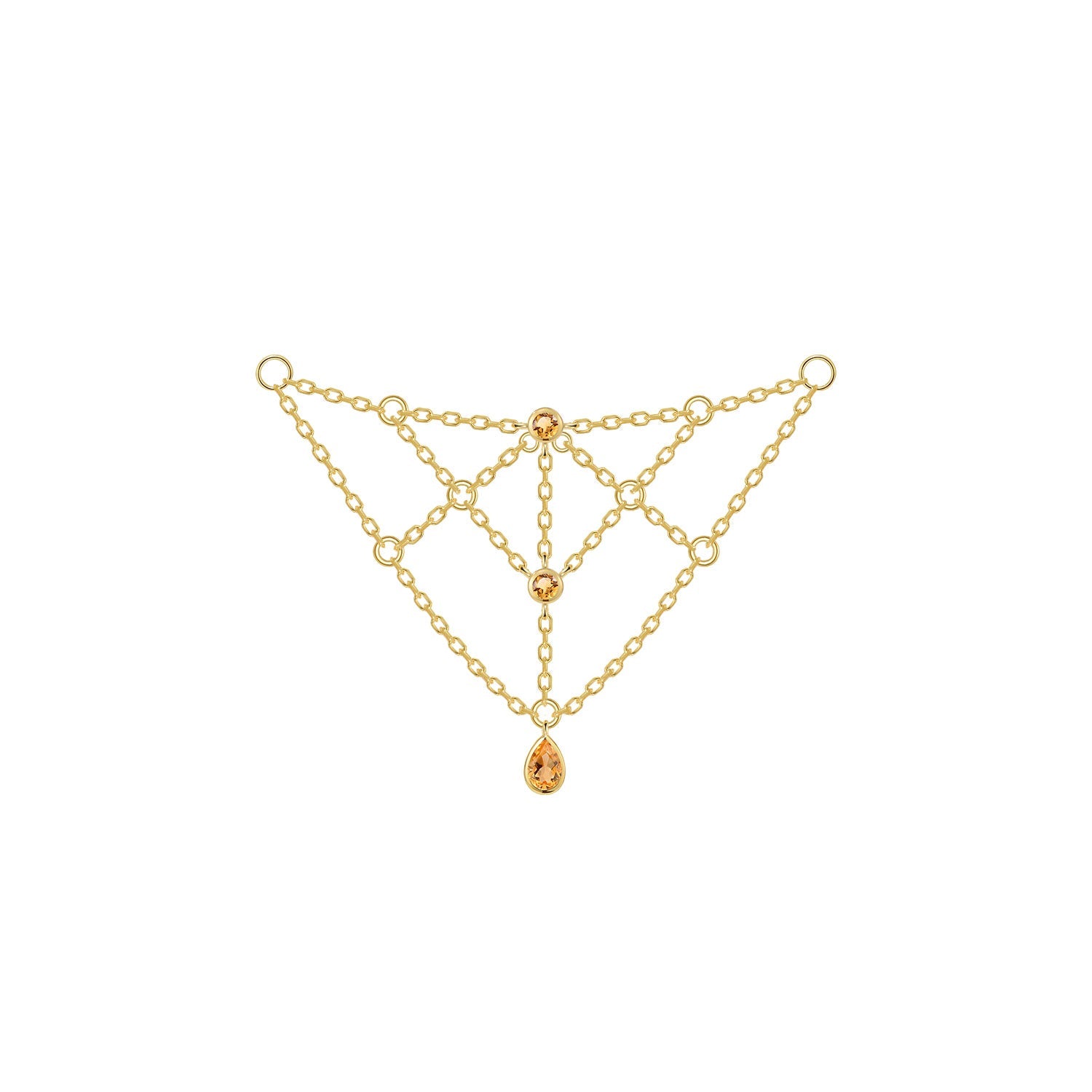 A web of delicate chains with bezel set round and pear gemstones adorning along the center